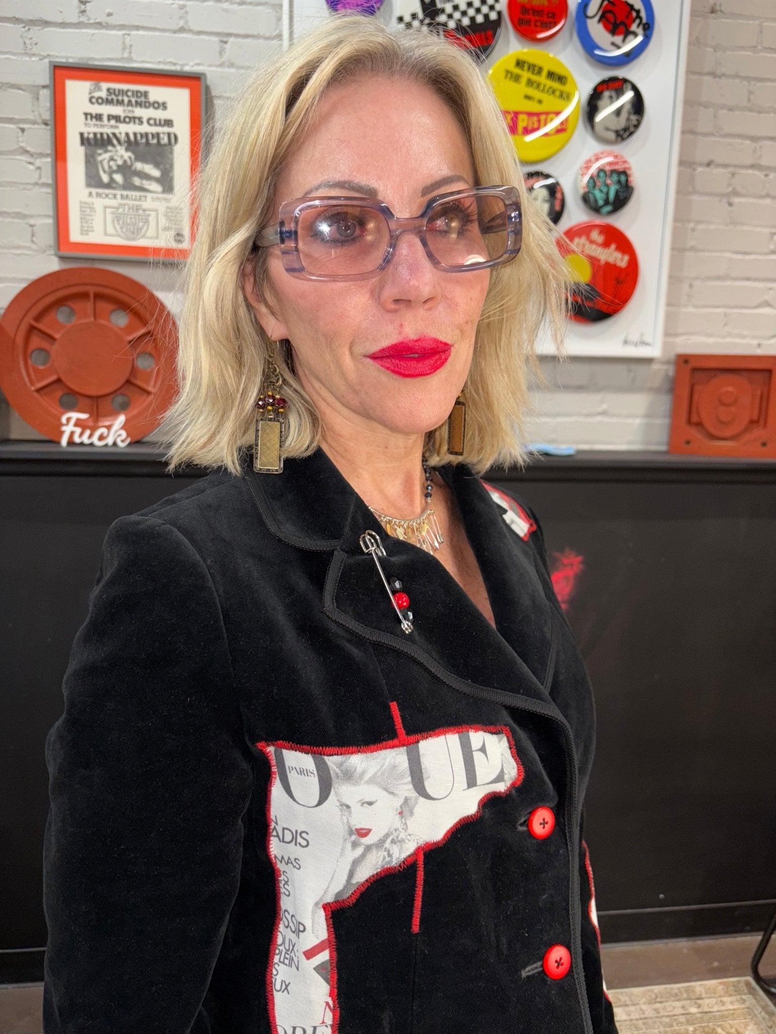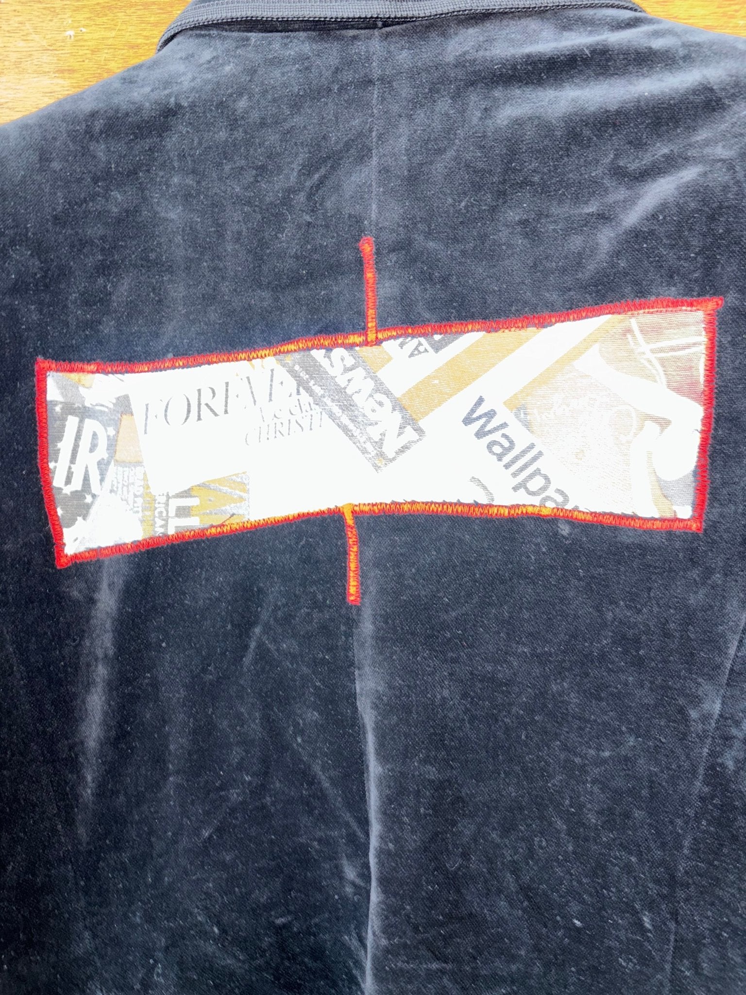 This jacket embodies the perfect marriage between high fashion and punk aesthetics. The velvet provides an opulent foundation while the Vogue magazine elements celebrate fashion history, creating a piece that's both reverent and rebellious.