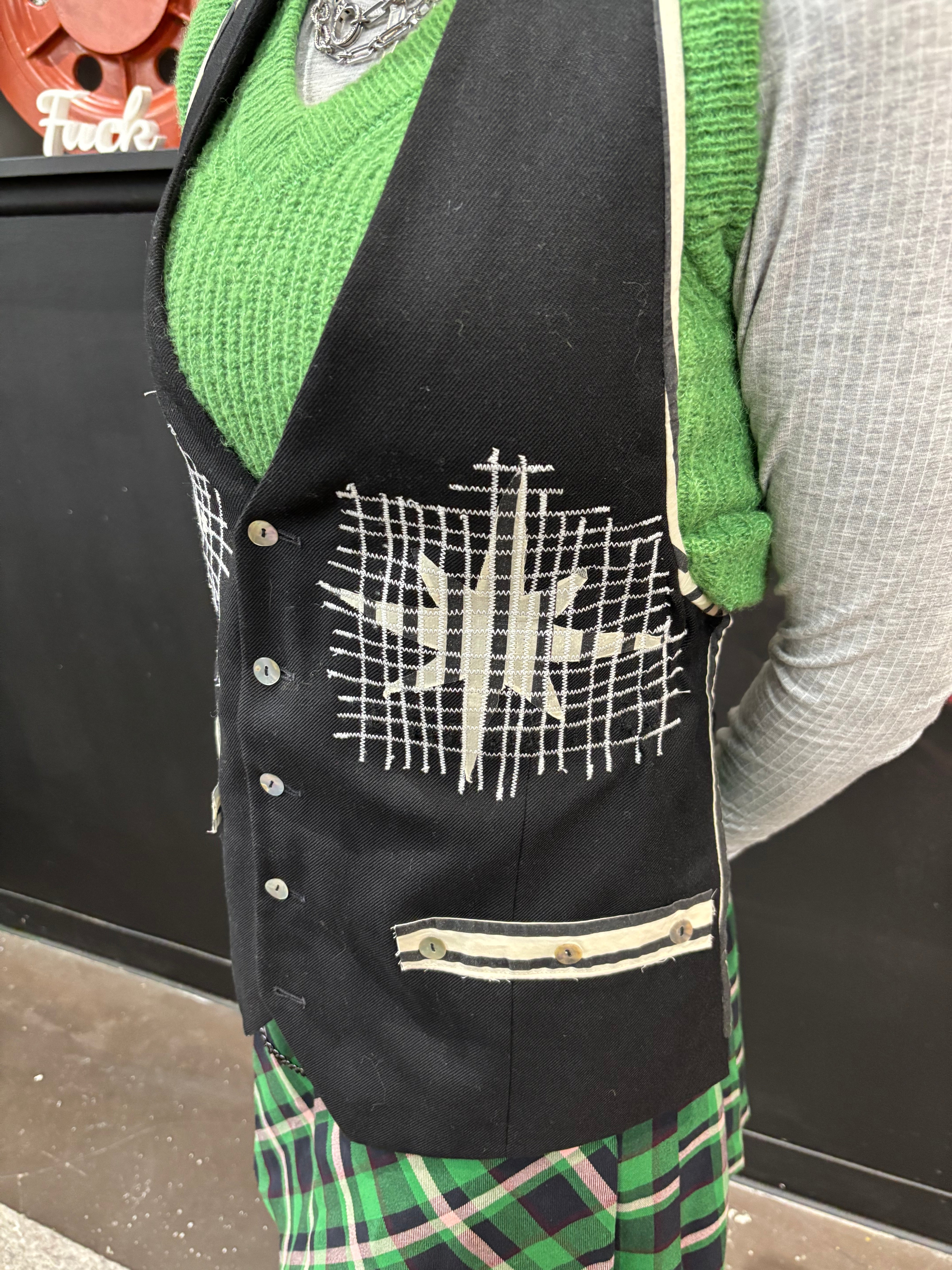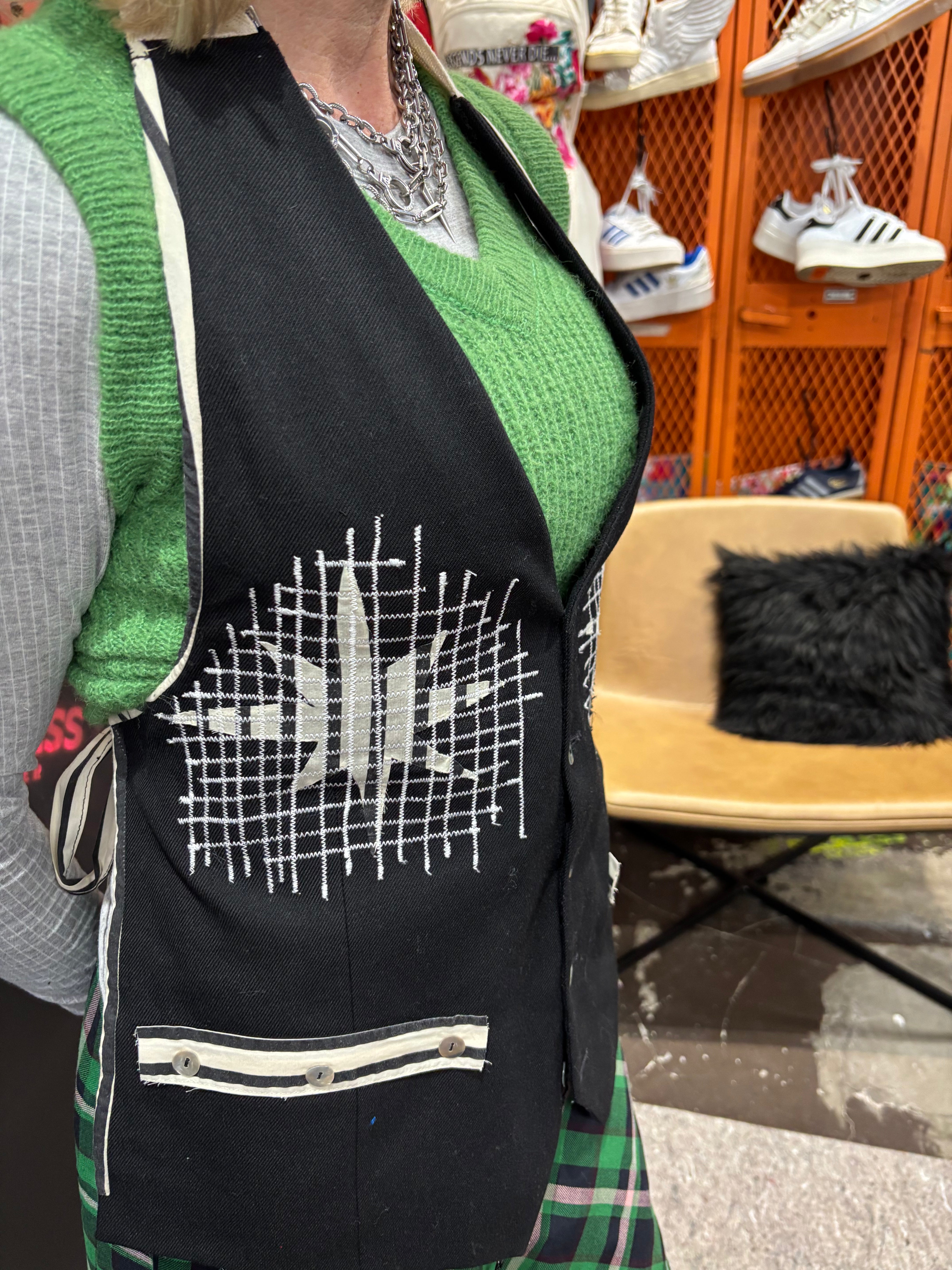 Black Wool Punk Vest - Custom Stitch with Tie Back & Pockets