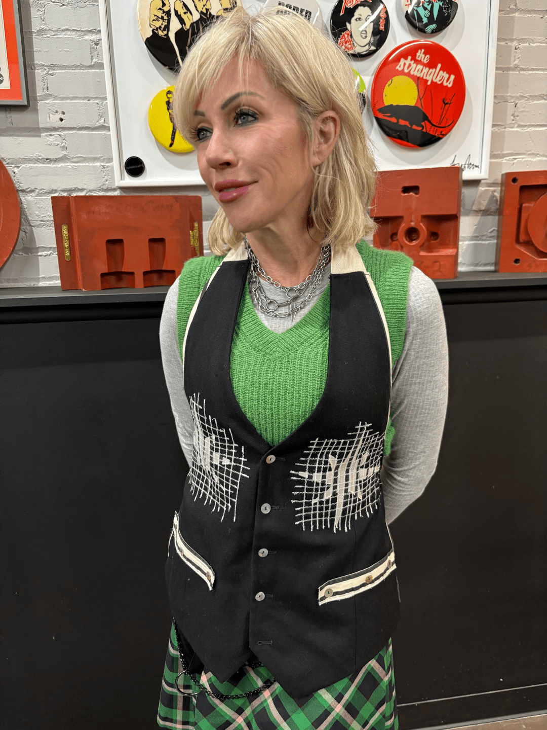 Style Notes: Layer over crisp white shirts for sharp contrast, pair with band tees for casual edge, or wear over dresses for unexpected dimension. The black wool is endlessly versatile, working in professional settings while maintaining that unmistakable punk attitude. The tie back lets you control the fit—cinch it tight for structure or leave it loose for flow.