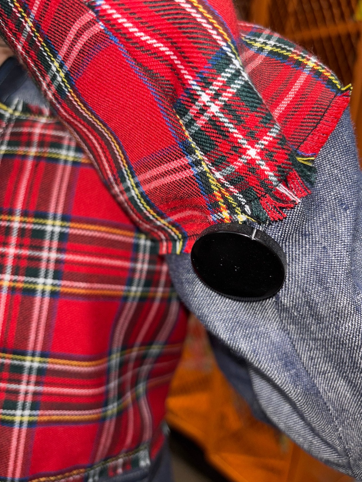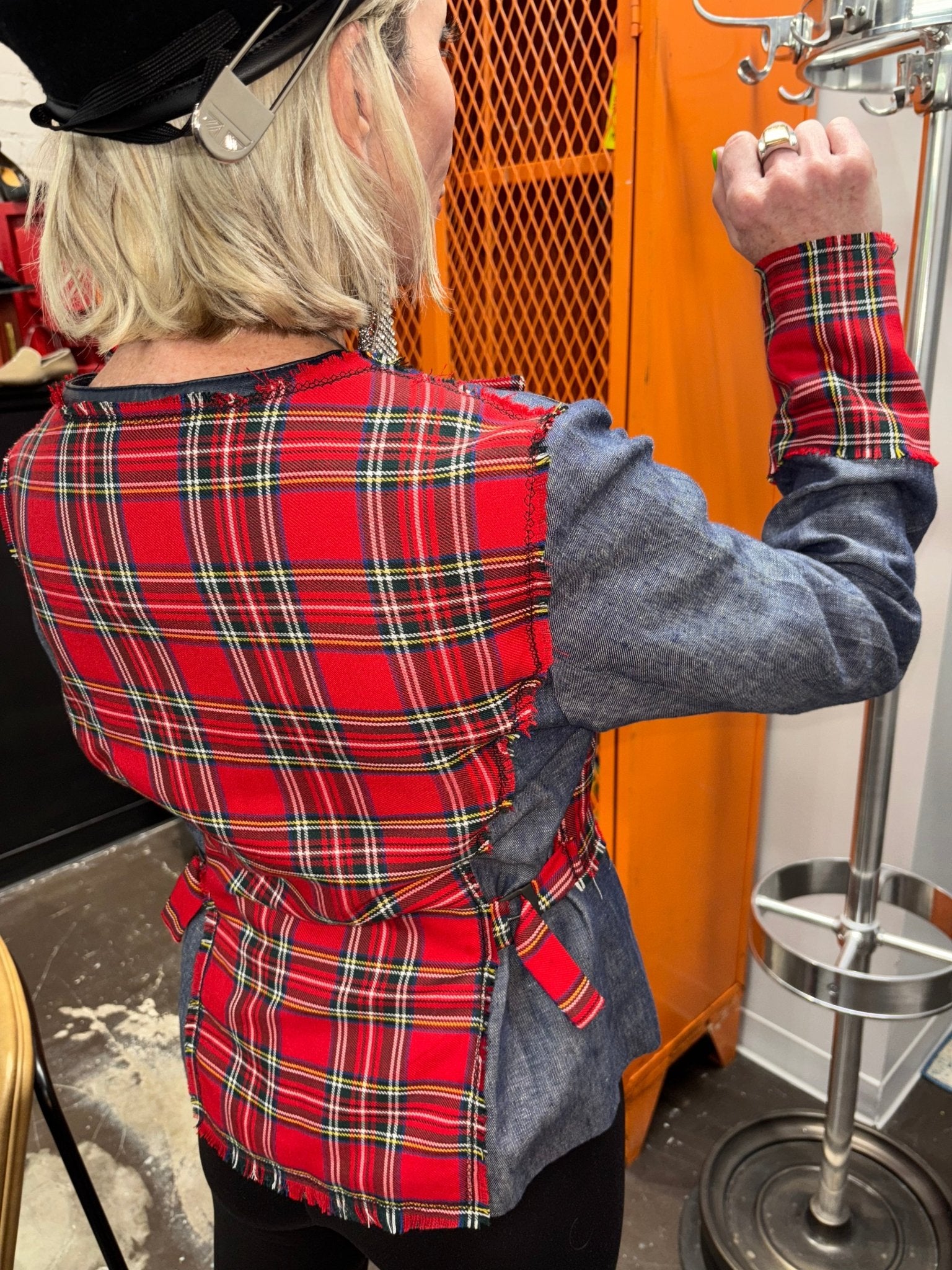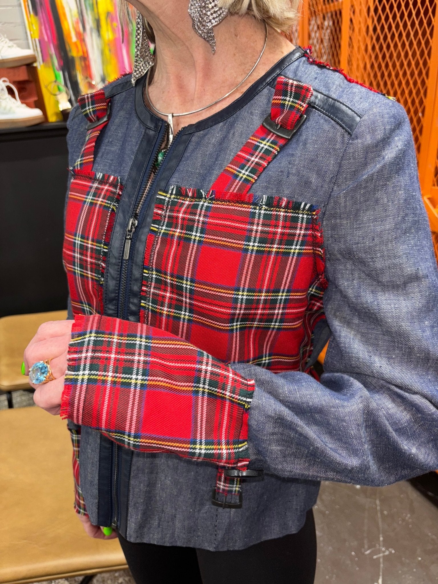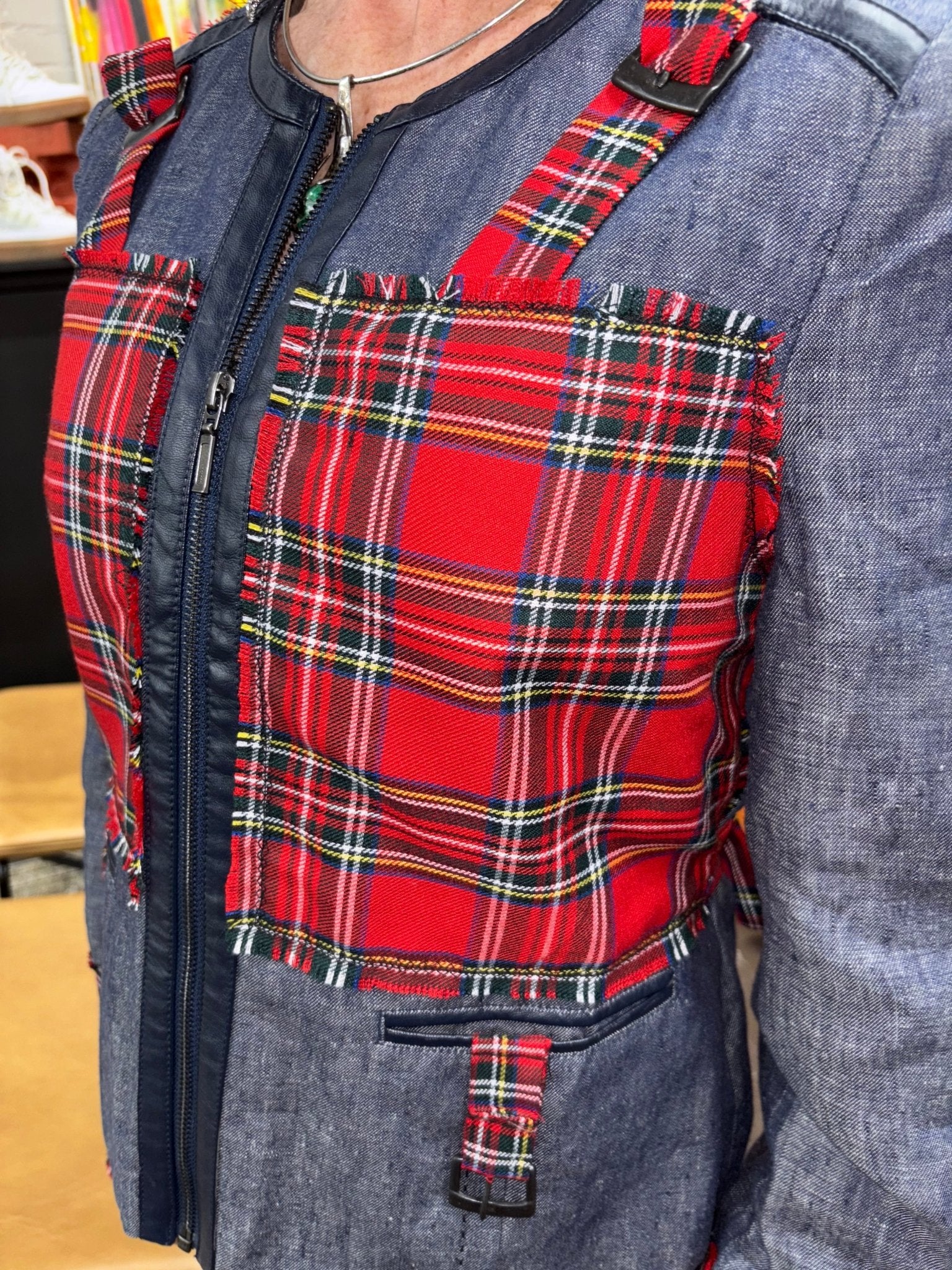 Make a bold statement with our striking Chambray Box Jacket in Red Tartan with authentic bondage buckle detailing. This isn't just outerwear—it's wearable rebellion.