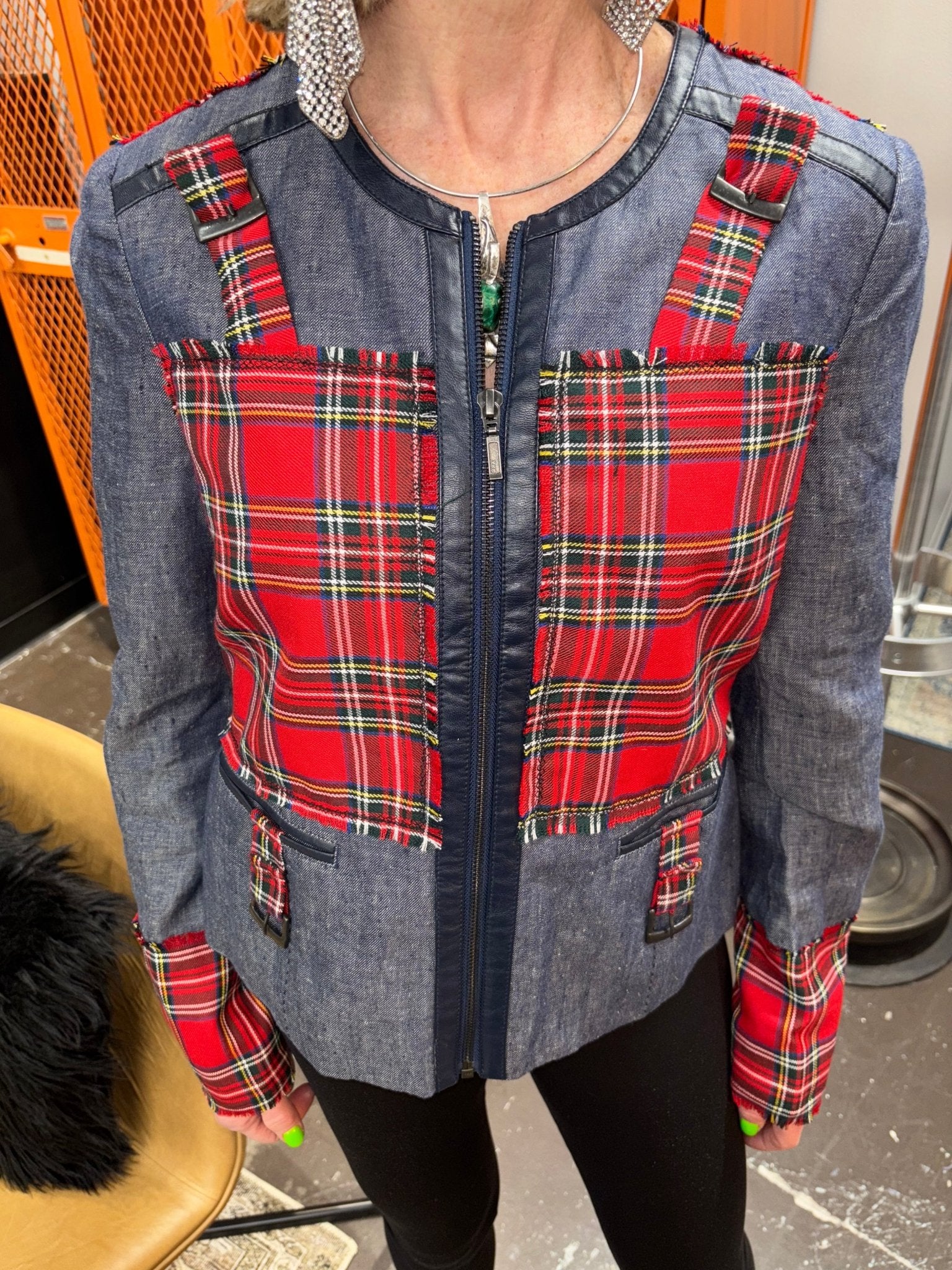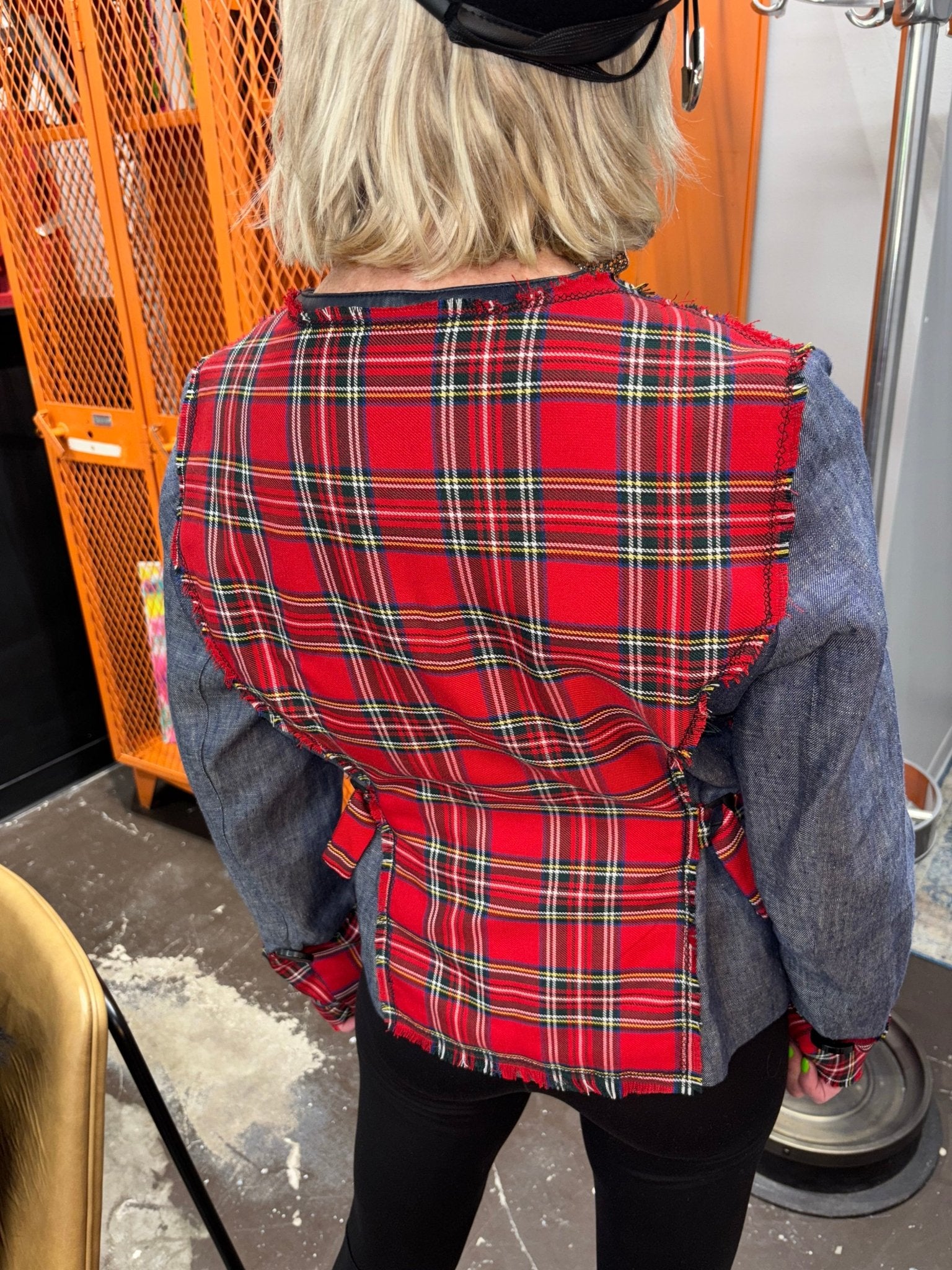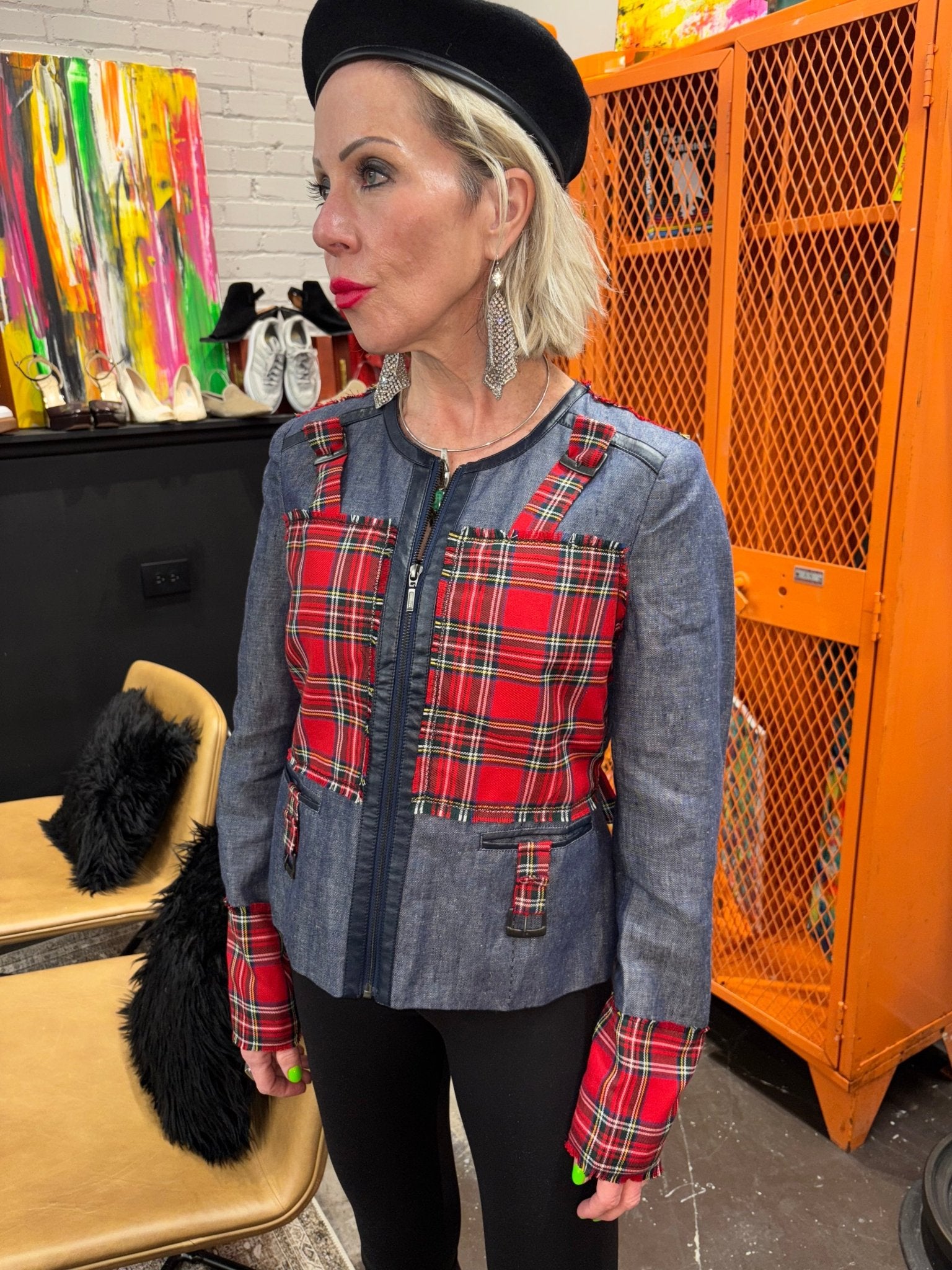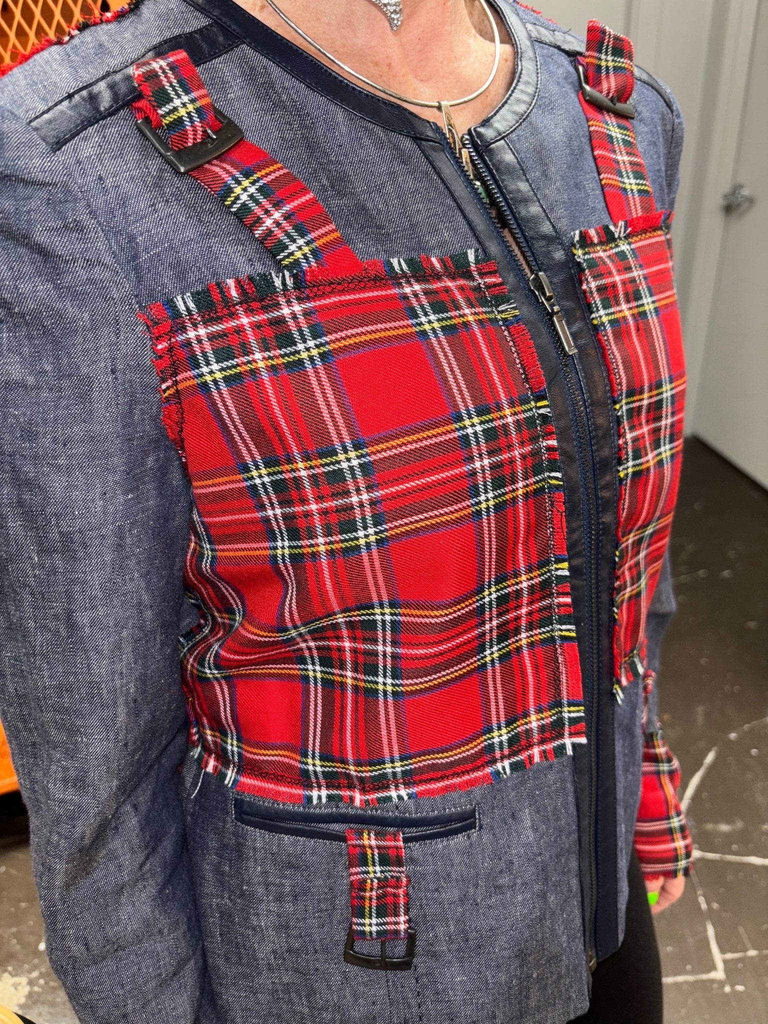 Red Tartan Chambray Box Jacket with Bondage Buckles - Edgy Designer Outerwear - Reckless Swagger