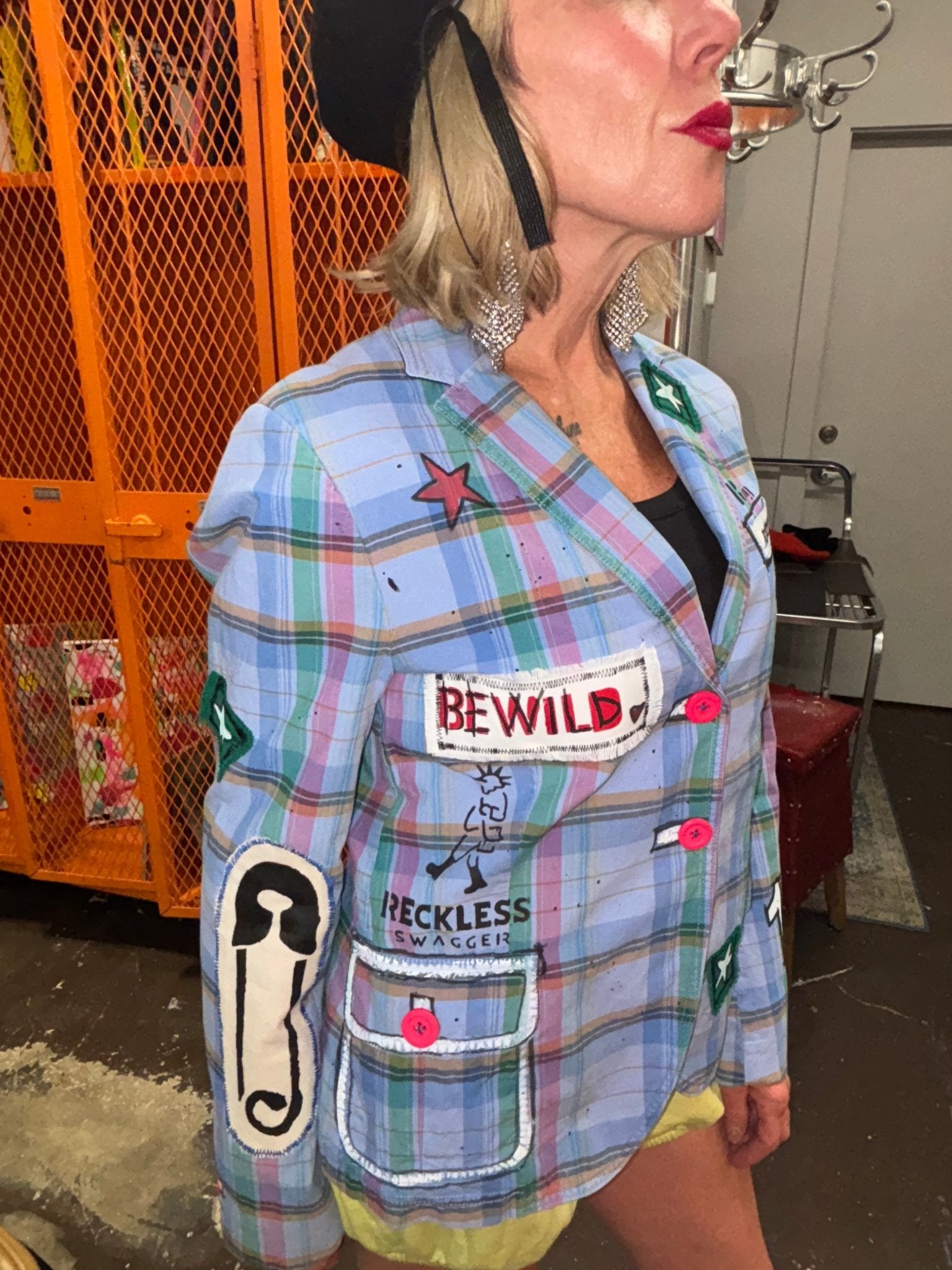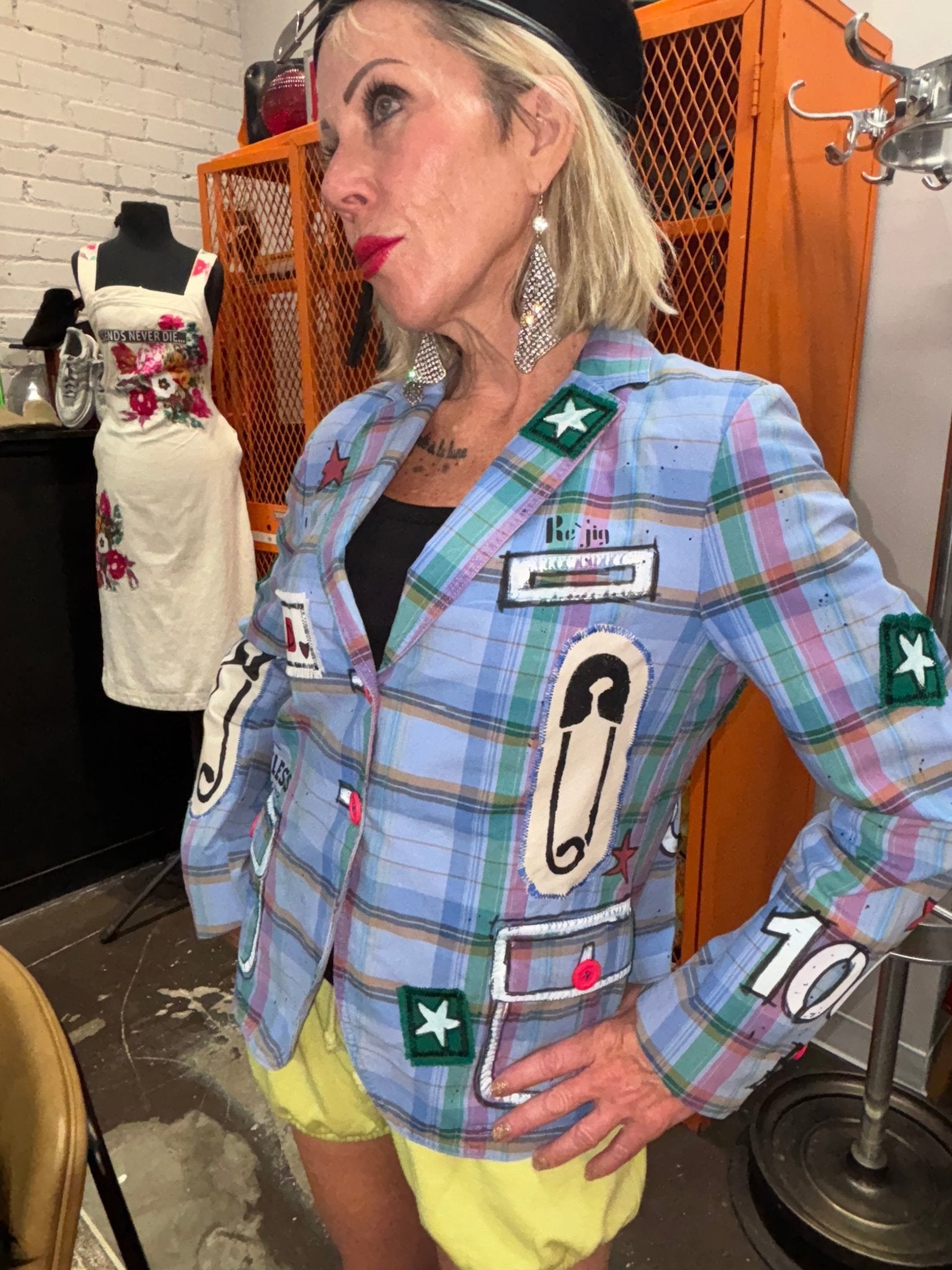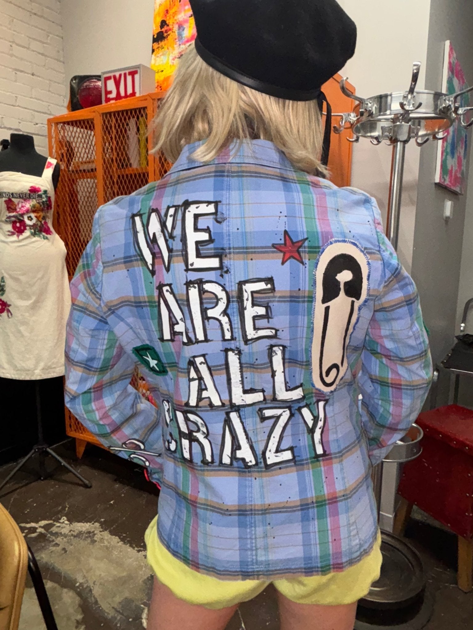 Colorful Plaid Blue Safety Pin Jacket - 'We Are All Crazy' Statement Piece