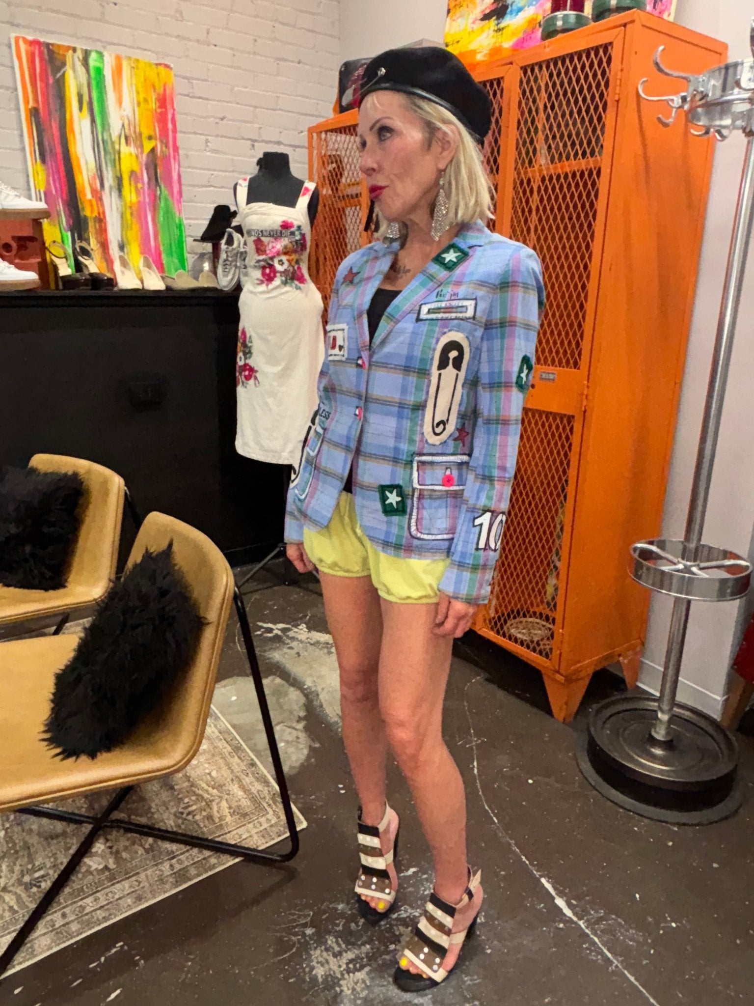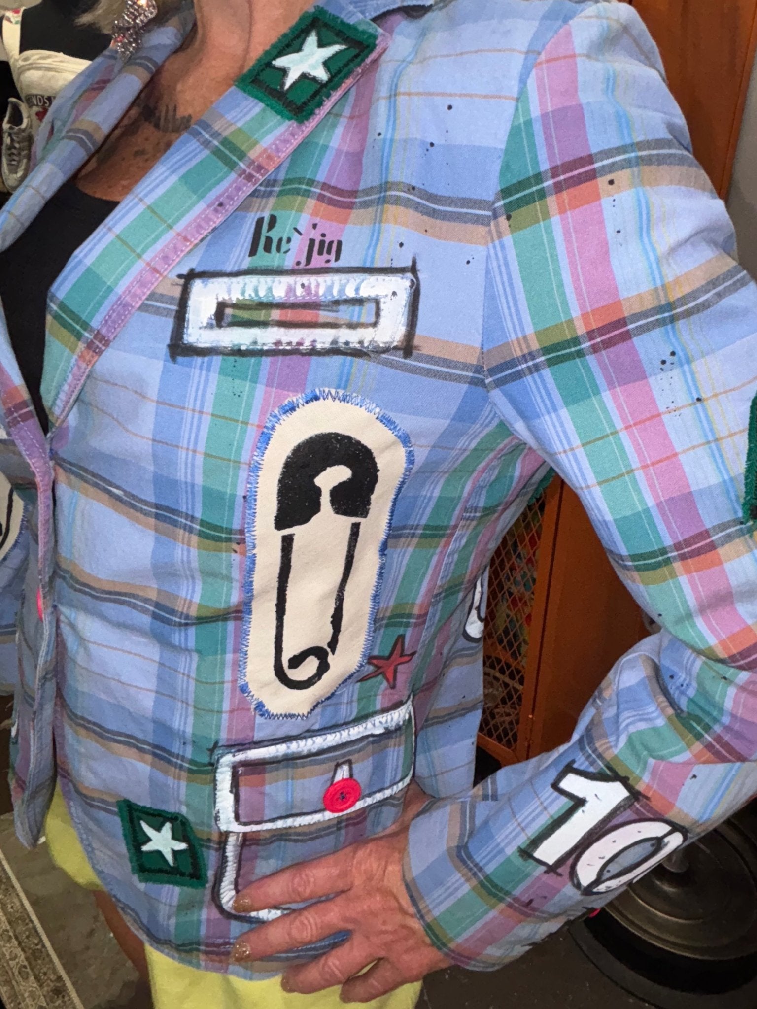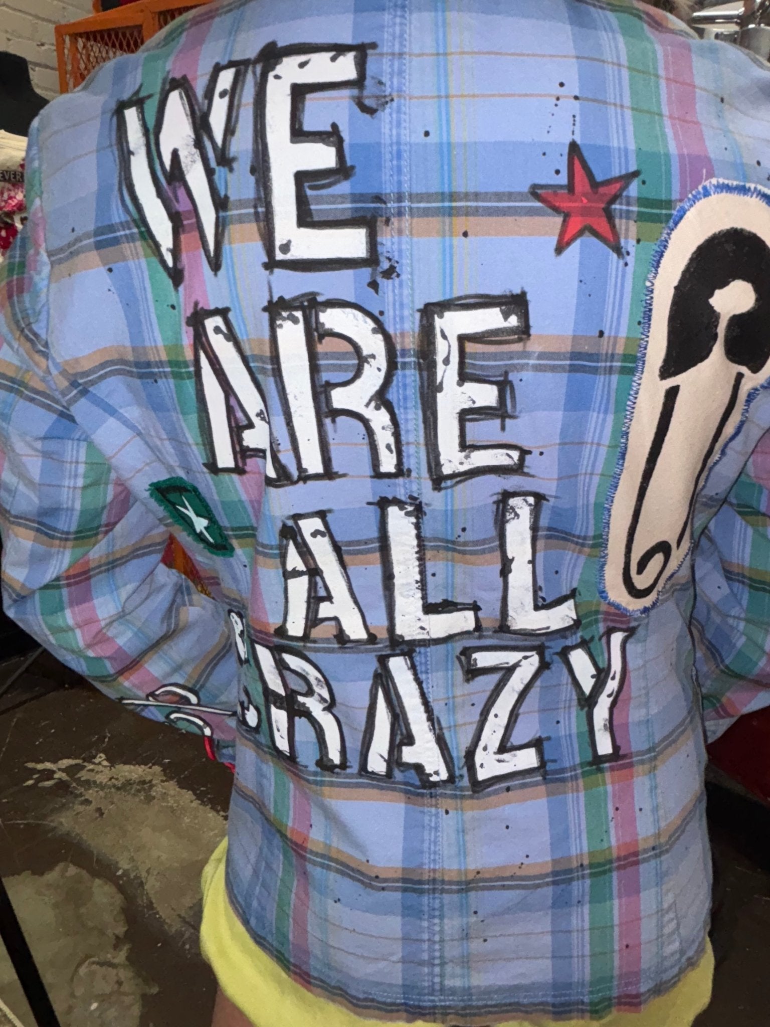 Colorful Plaid Blue Safety Pin Jacket - 'We Are All Crazy' Statement Piece