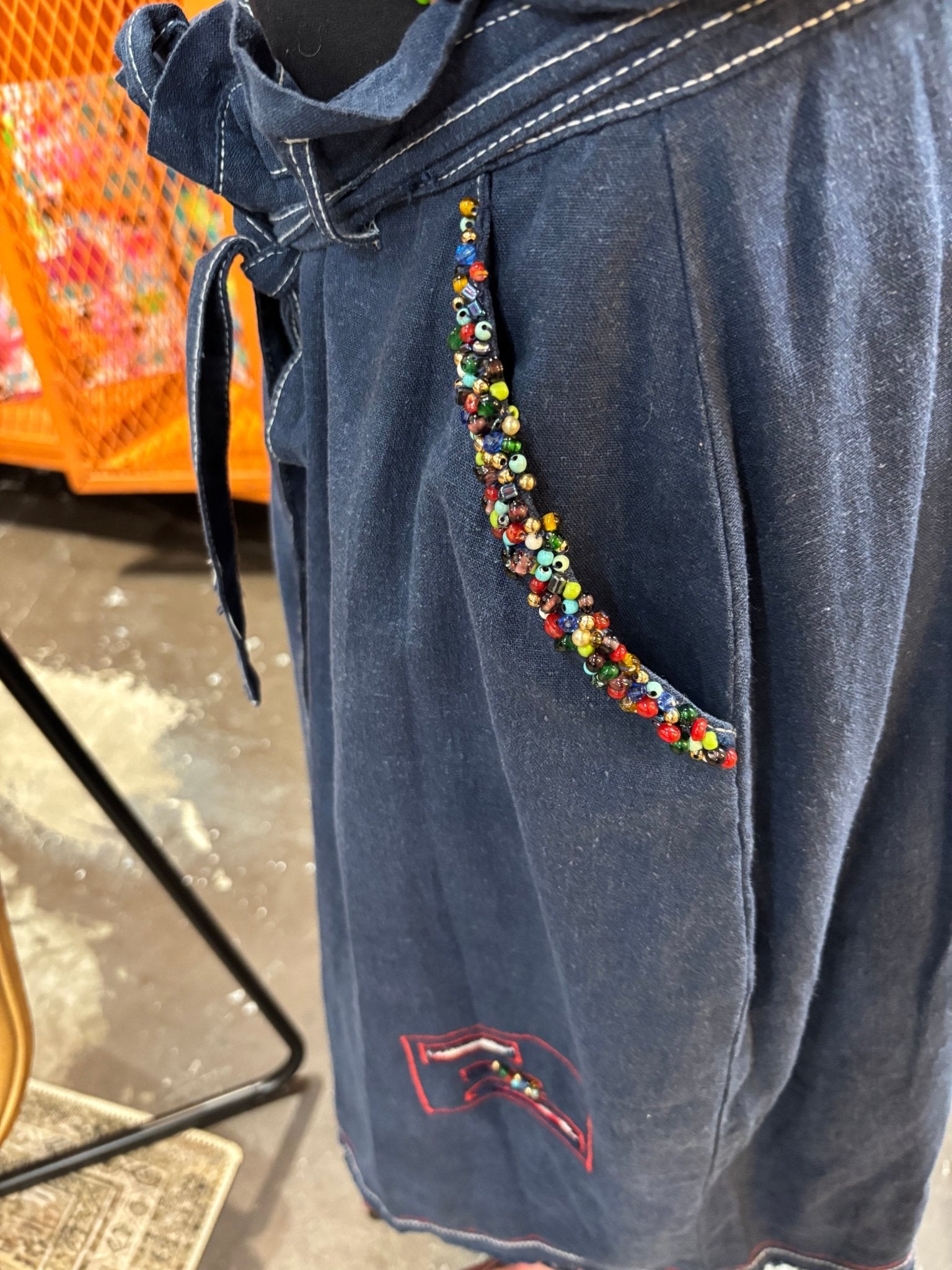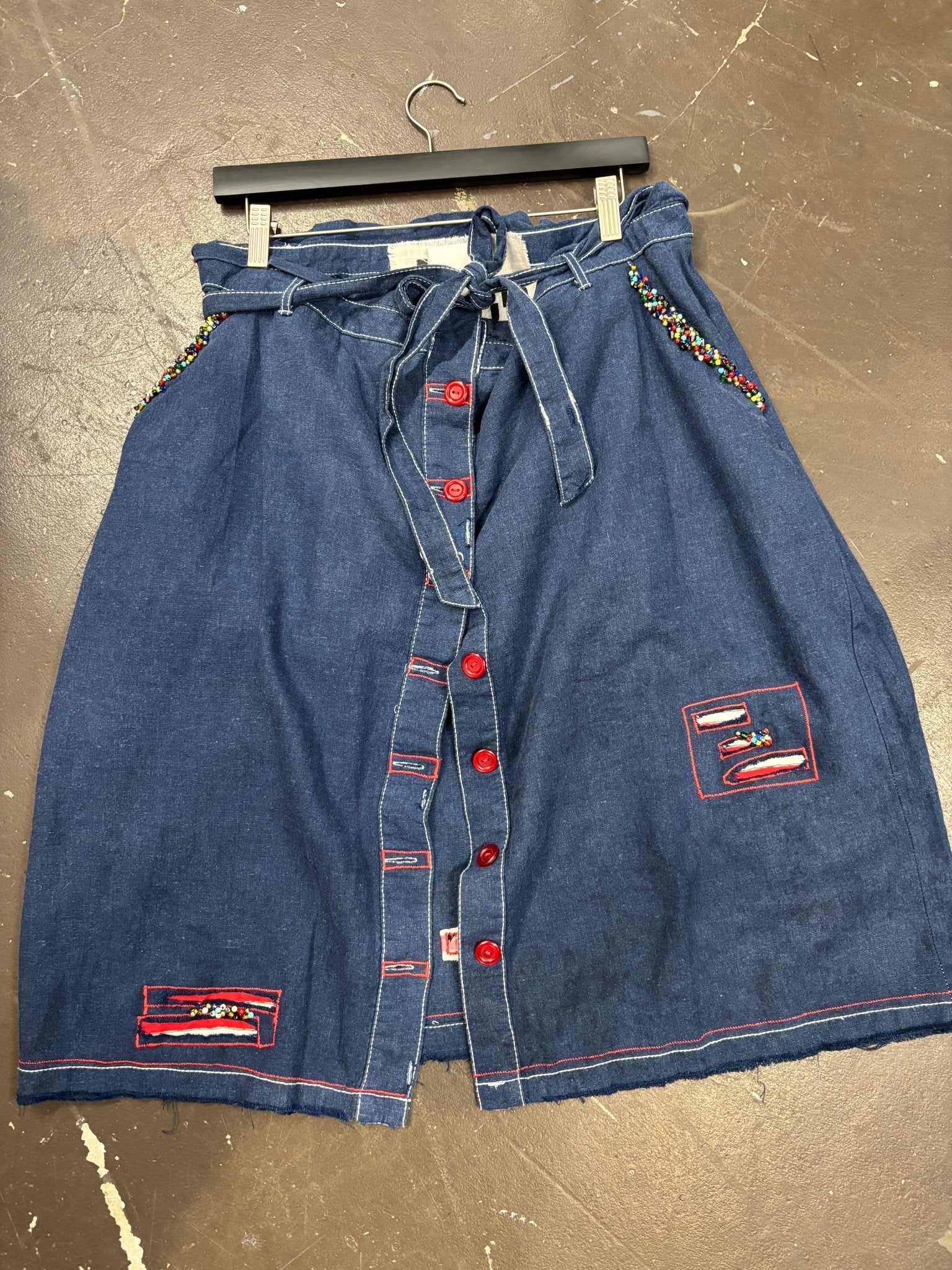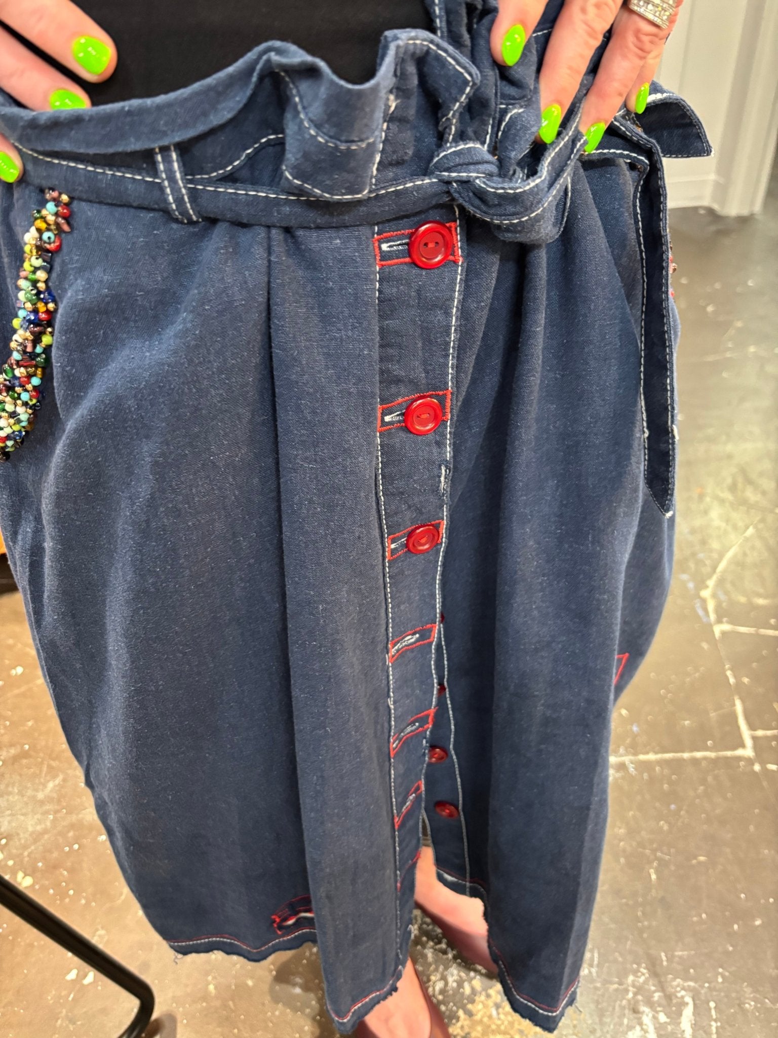 Denim Colored Linen Tie Belt Dress - Red Buttons Bead-Lined Pocket Custom Details
