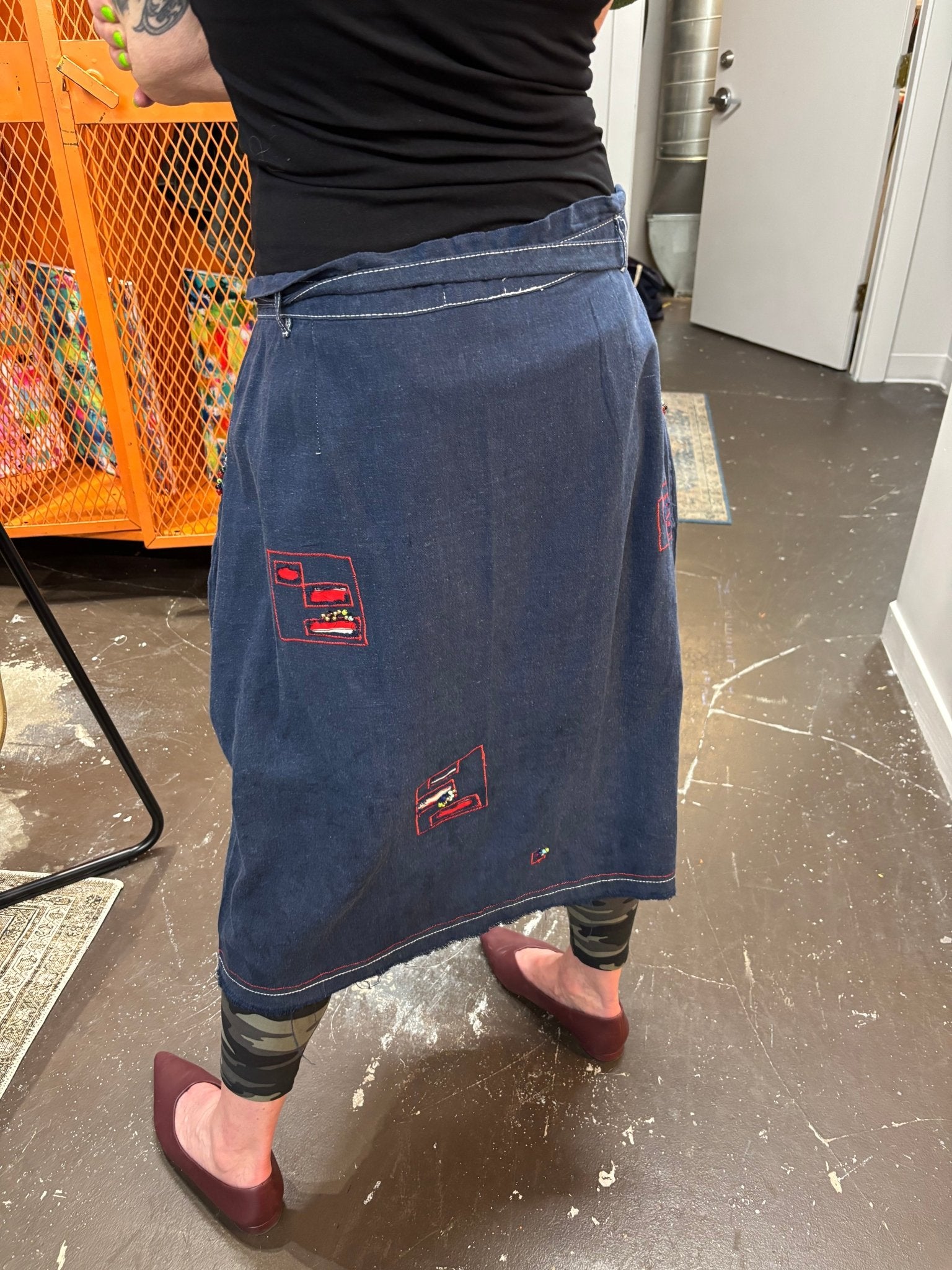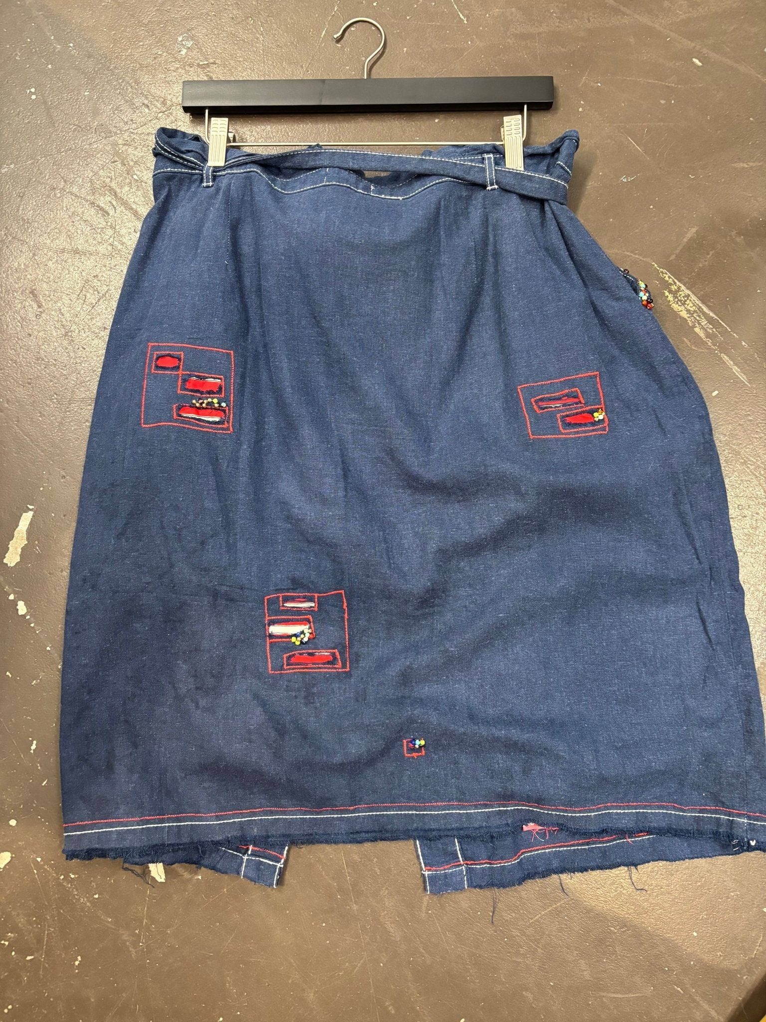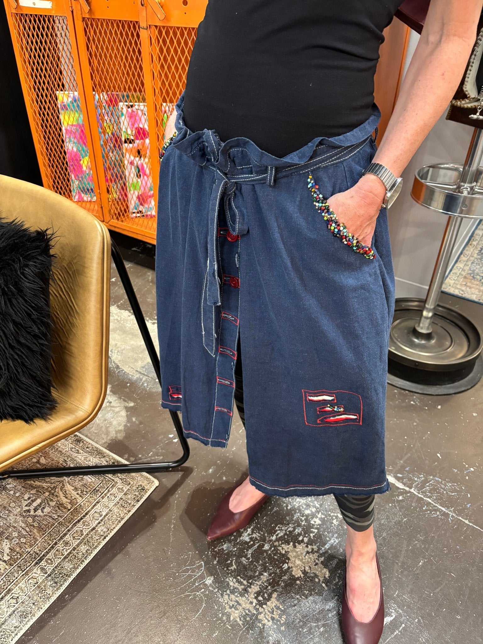 Denim Colored Linen Tie Belt Dress - Red Buttons Bead-Lined Pocket Custom Details