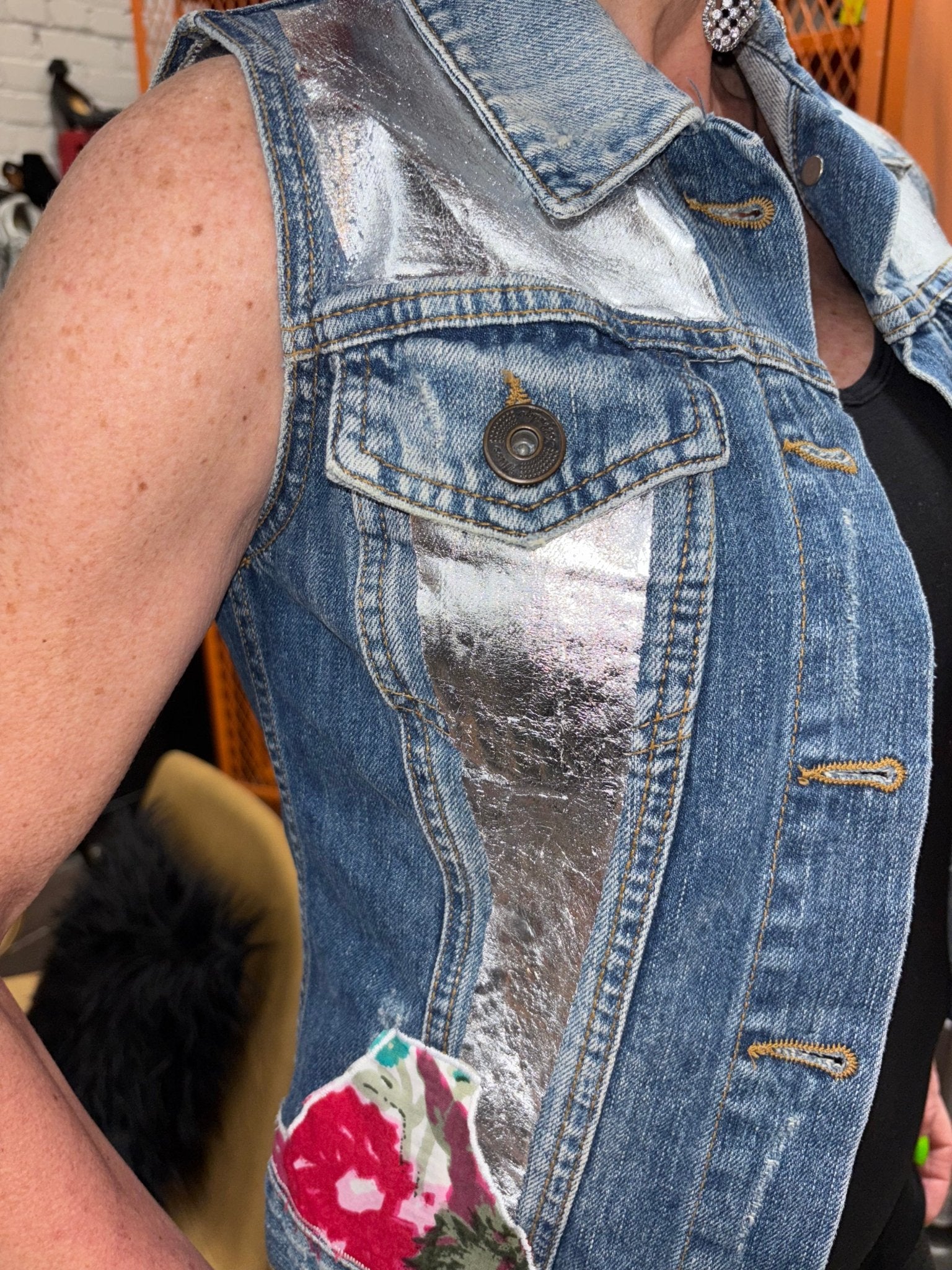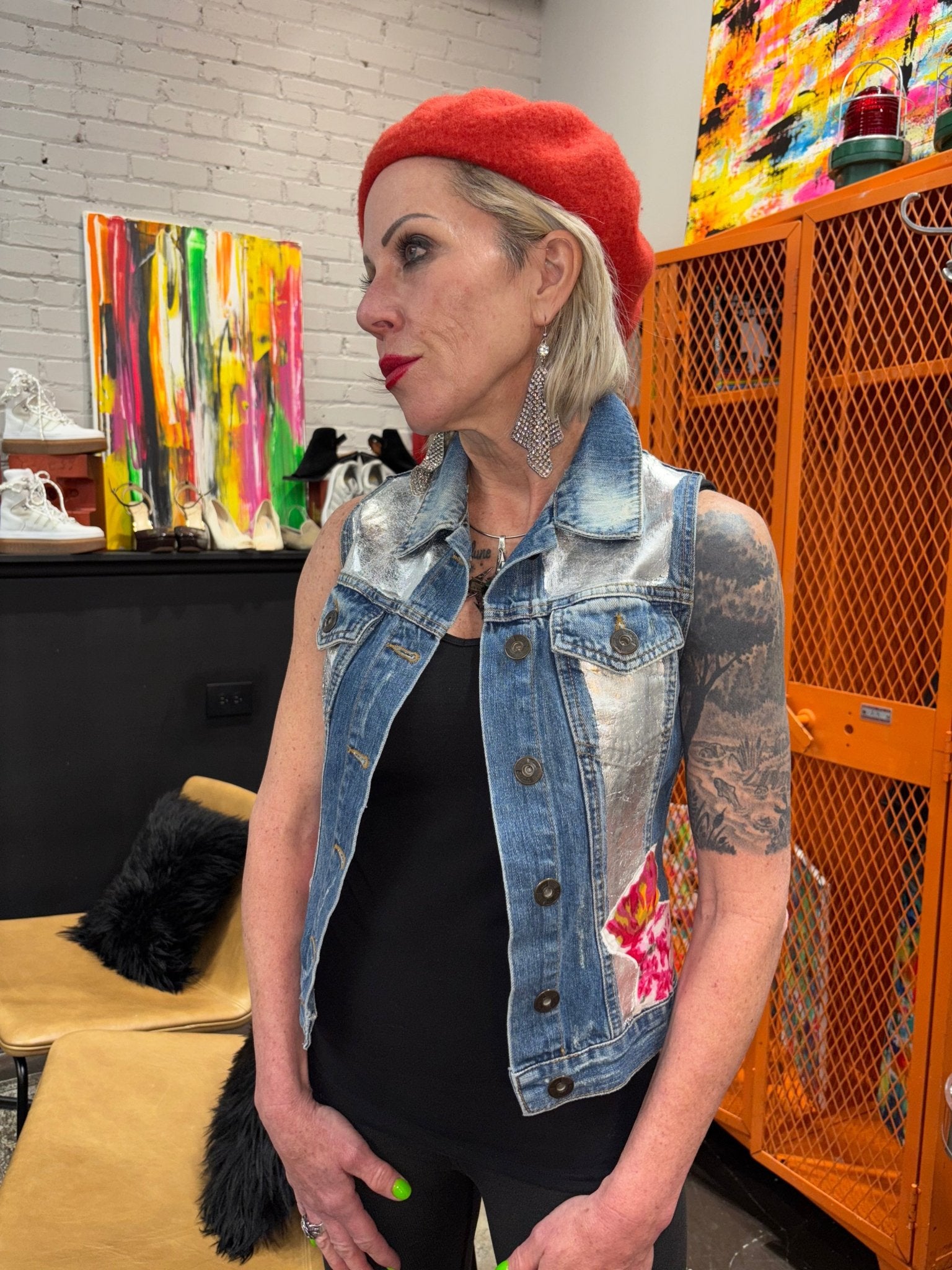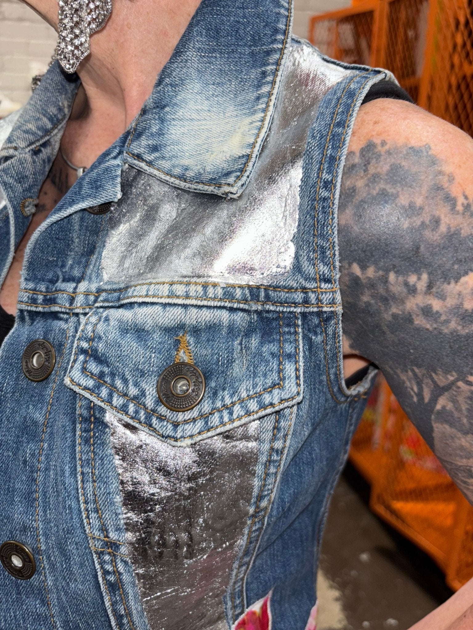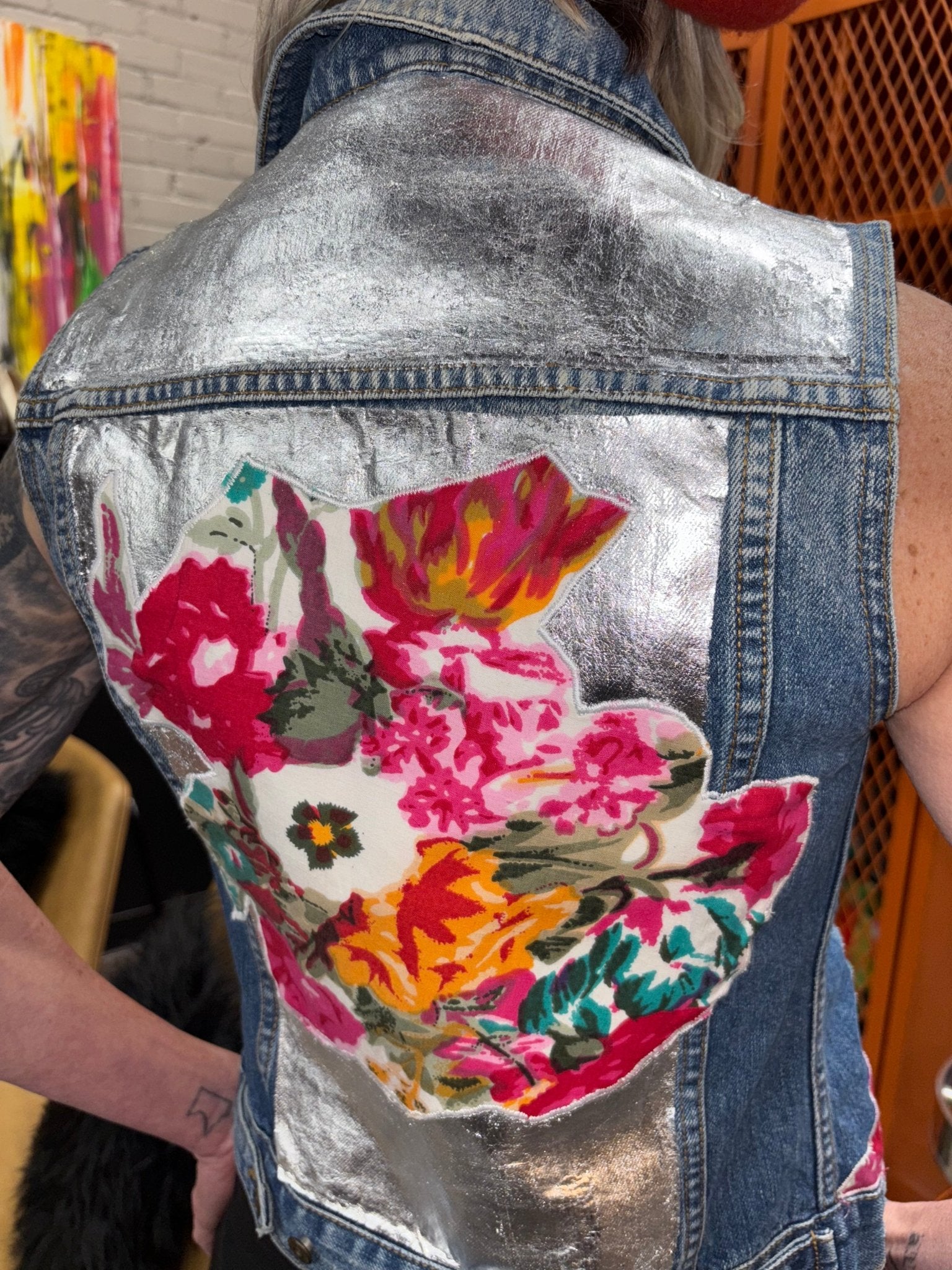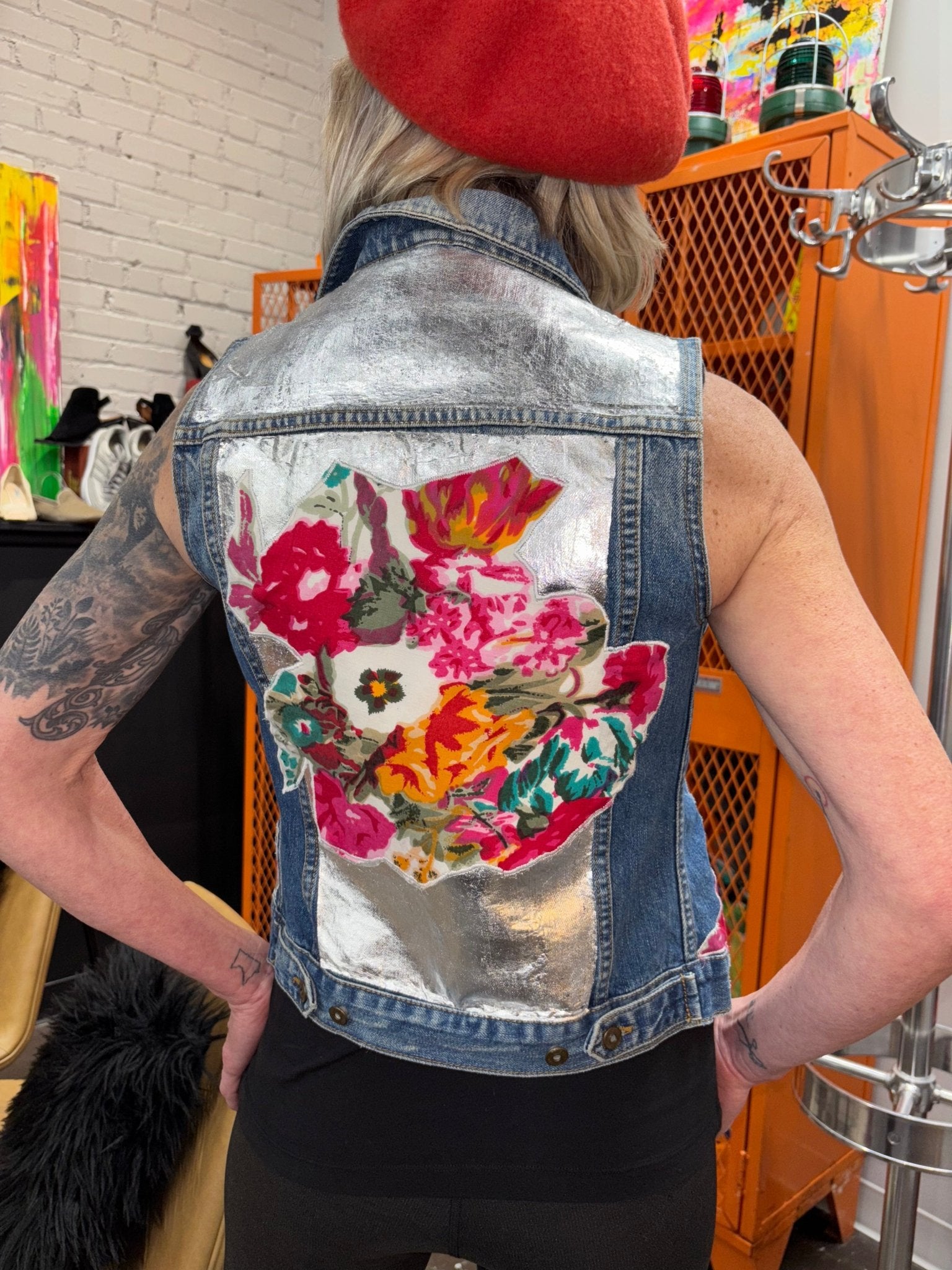 Silver Floral Hand-Painted Denim Vest - Fitted Punk Statement Piece