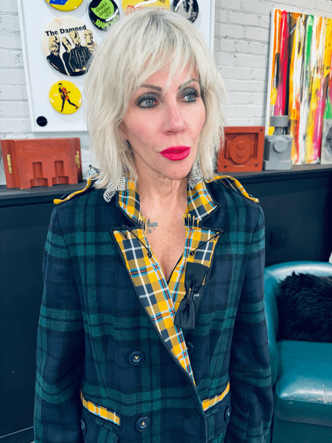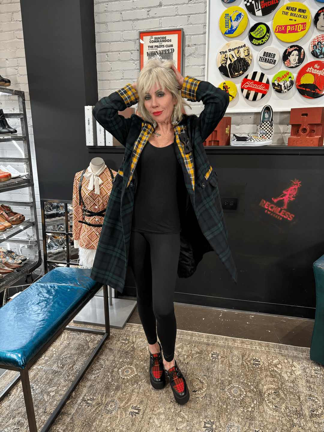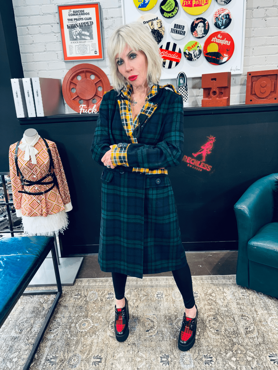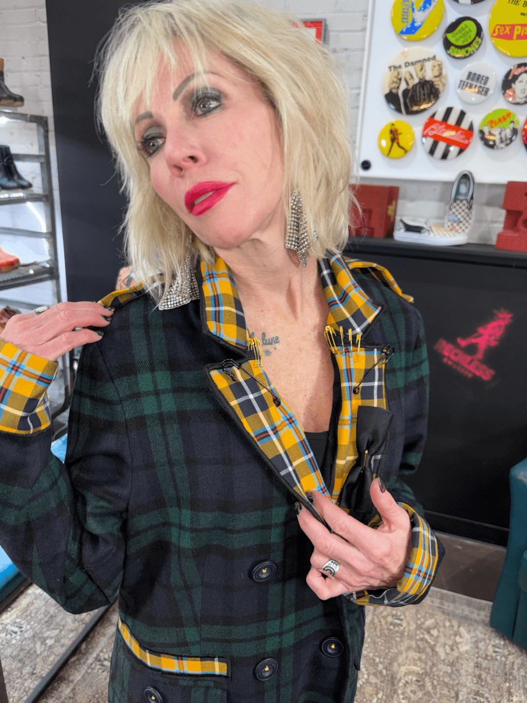 This green tartan coat is a masterclass in controlled rebellion. Classic structure collides with punk attitude through a bold yellow tartan contrast lapel and strategically placed industrial safety pins, transforming traditional outerwear into unapologetic punk couture. Handcrafted in England exclusively for Reckless Swagger, this piece stands alone — no duplicates, no reproductions.