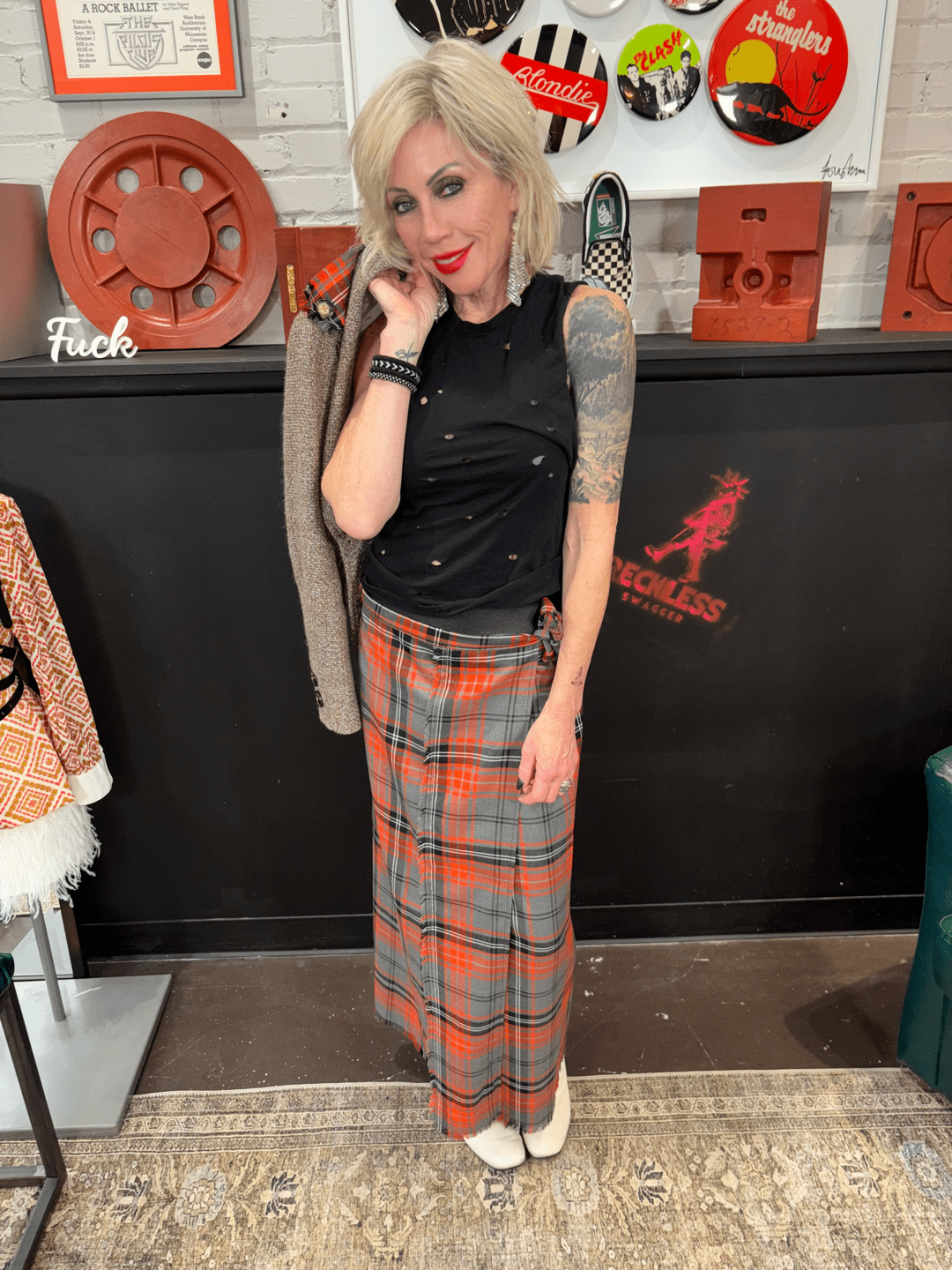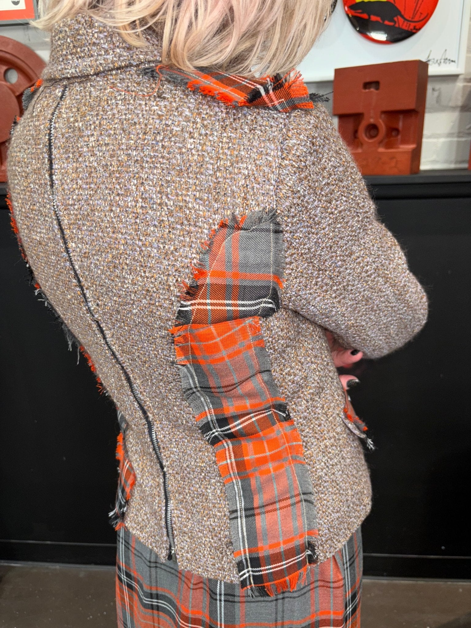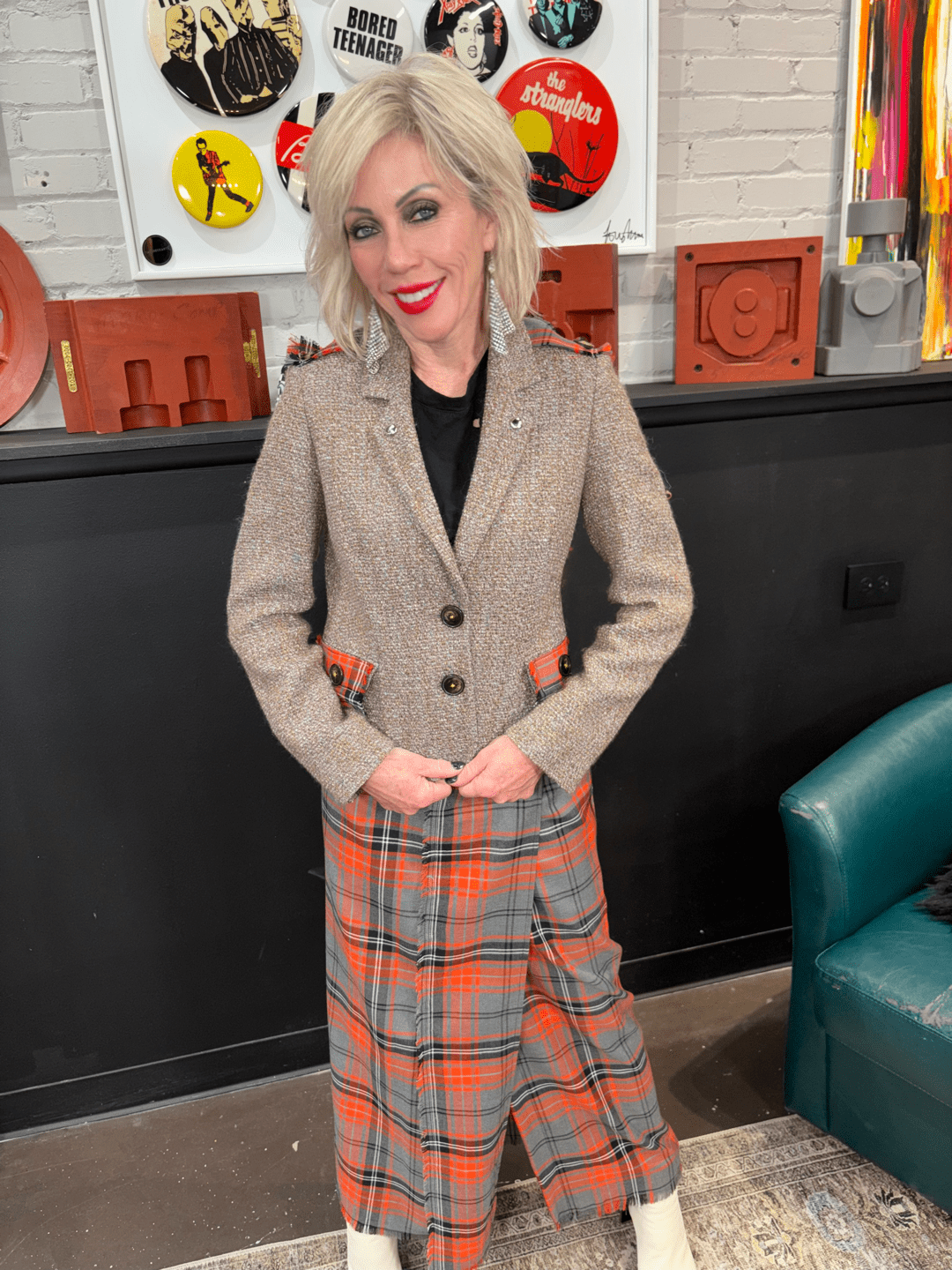 v grey and orange tartan suit base reworked into a dual-skirt ensemble for unique silhouette and movement