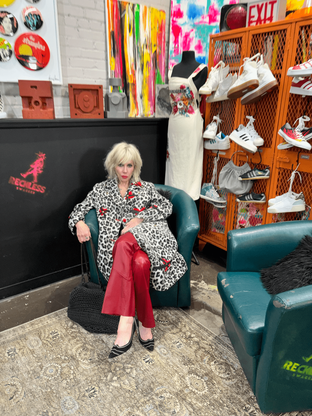 This leopard-print coat rewrites the rules of statement outerwear. The bold animal pattern is intensified with hand-applied red heart motifs, stark black crosses, and brass rivet detailing, creating a visual clash that feels both seductive and confrontational. Handcrafted in England exclusively for Reckless Swagger, this coat exists as a singular creation — no duplicates, no reproductions.