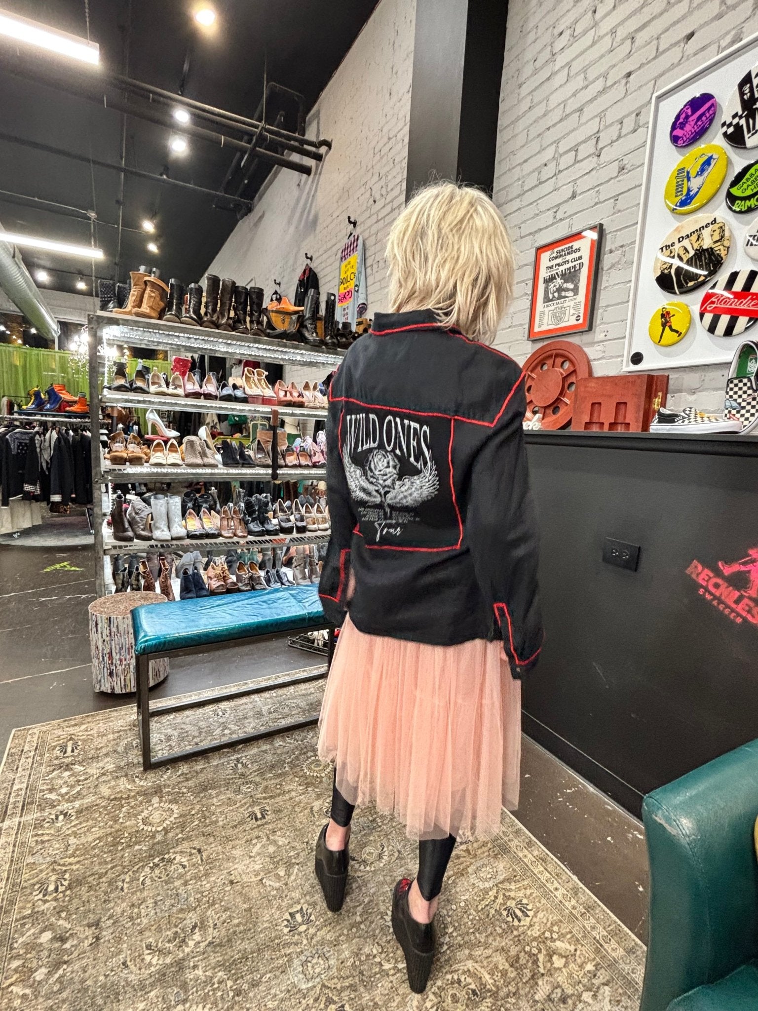 This Liner Shirt “WILD ONES” is punk romance in motion—roses, angel wings, and red stitching that looks like it was drawn with intent and nerve.