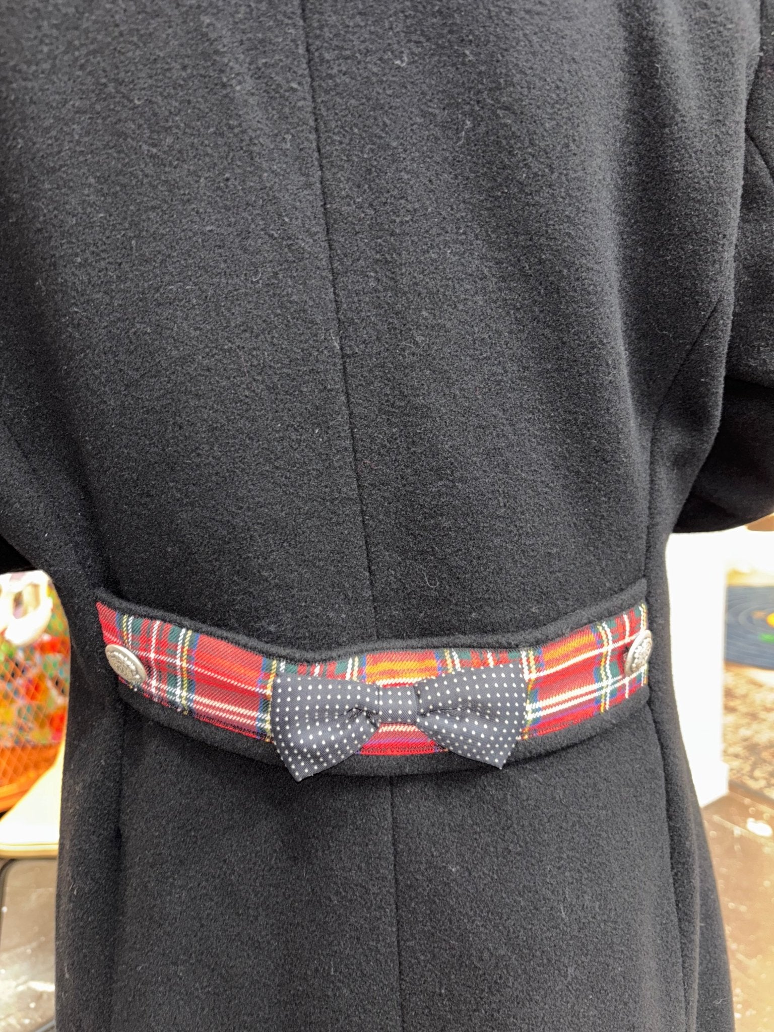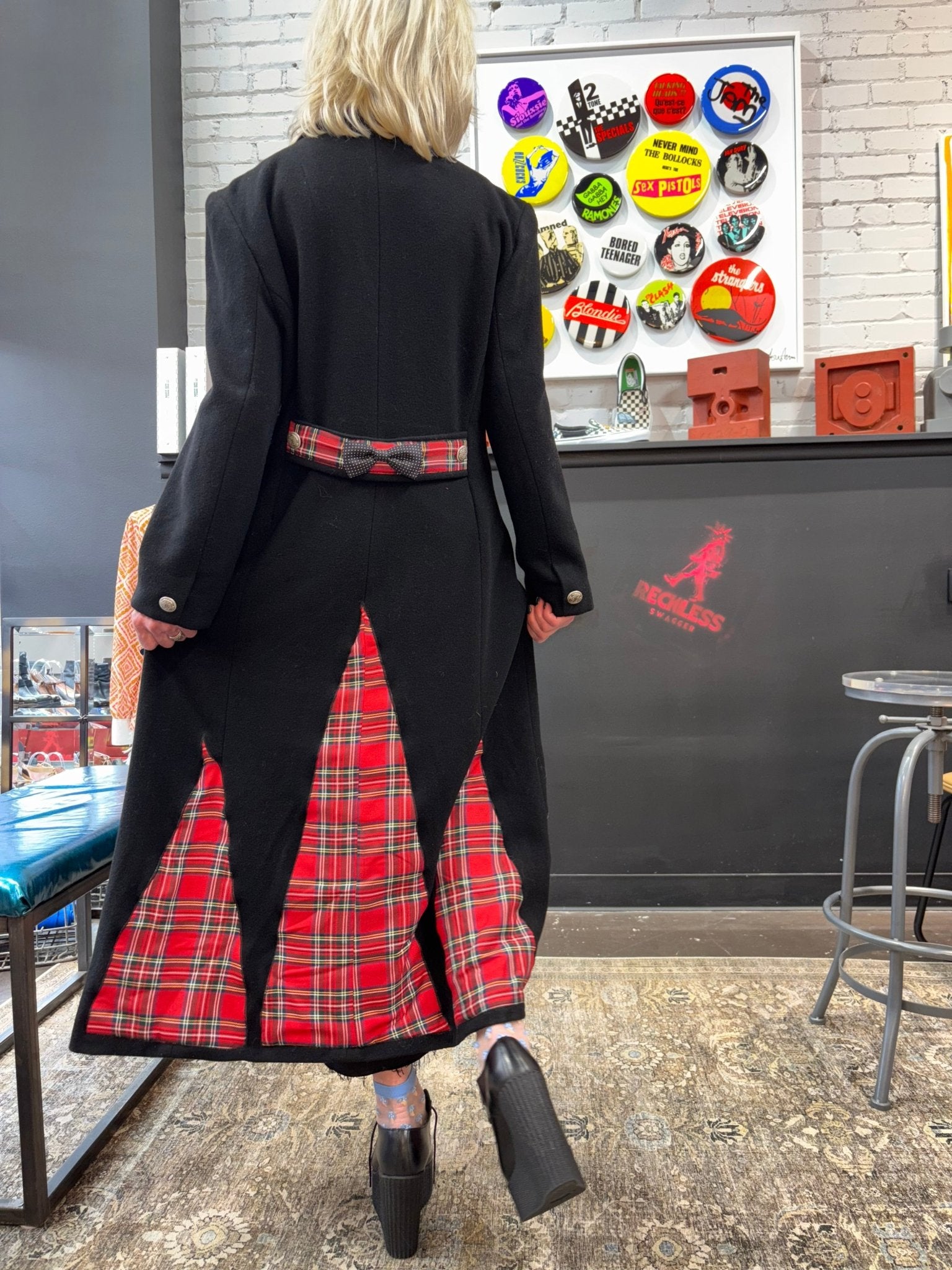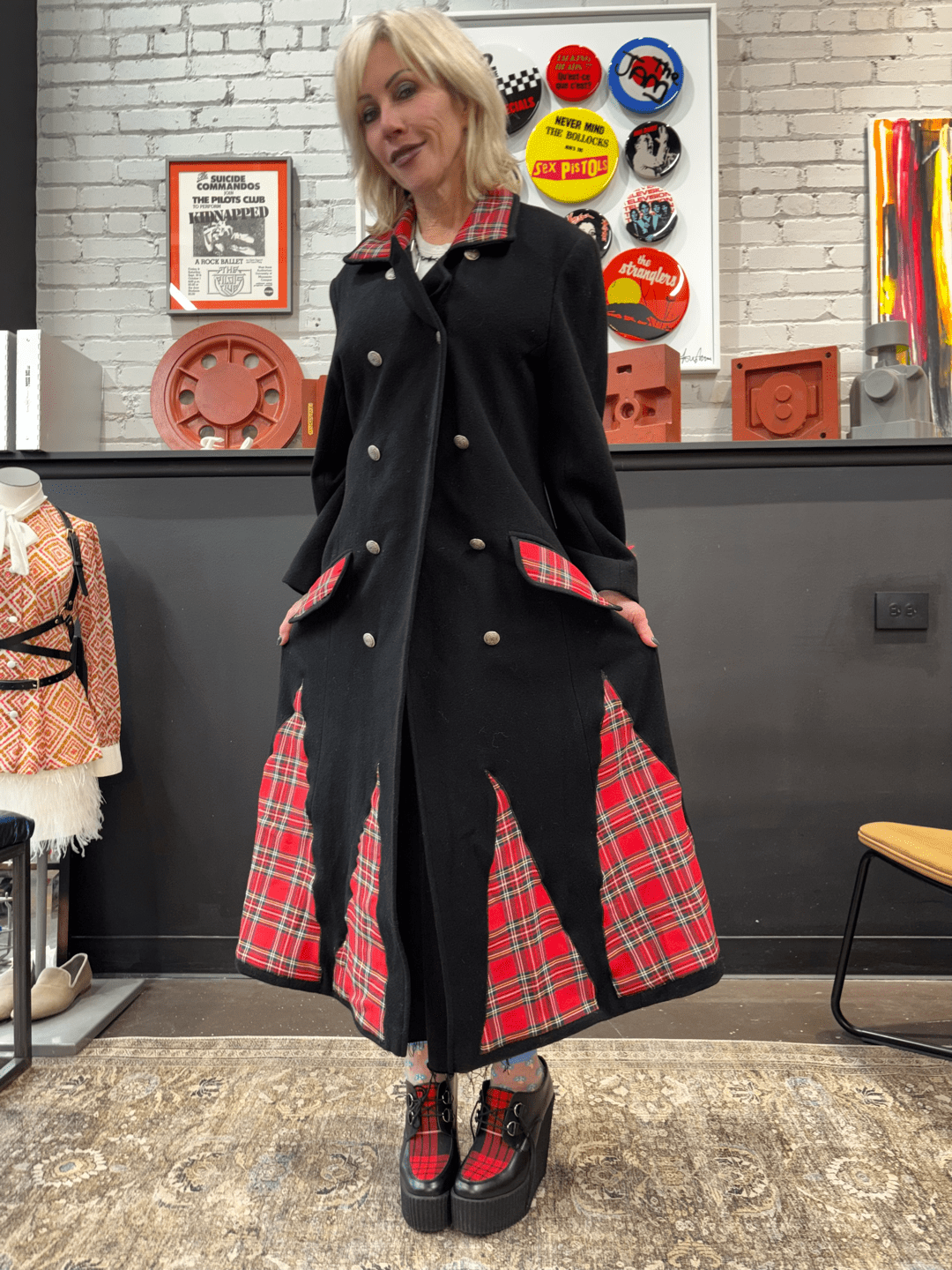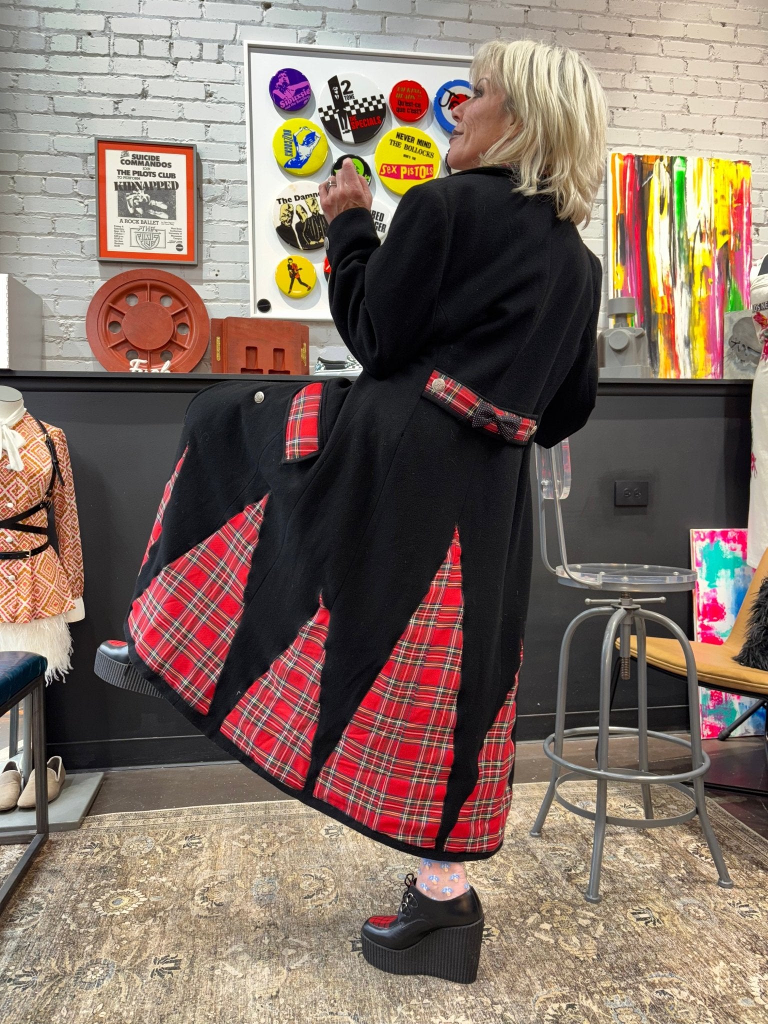 Reworked Red Tartan Full-Length Black Wool Peacoat — One-of-a-Kind Handcrafted Punk Statement Exclusive Reckless Swagger