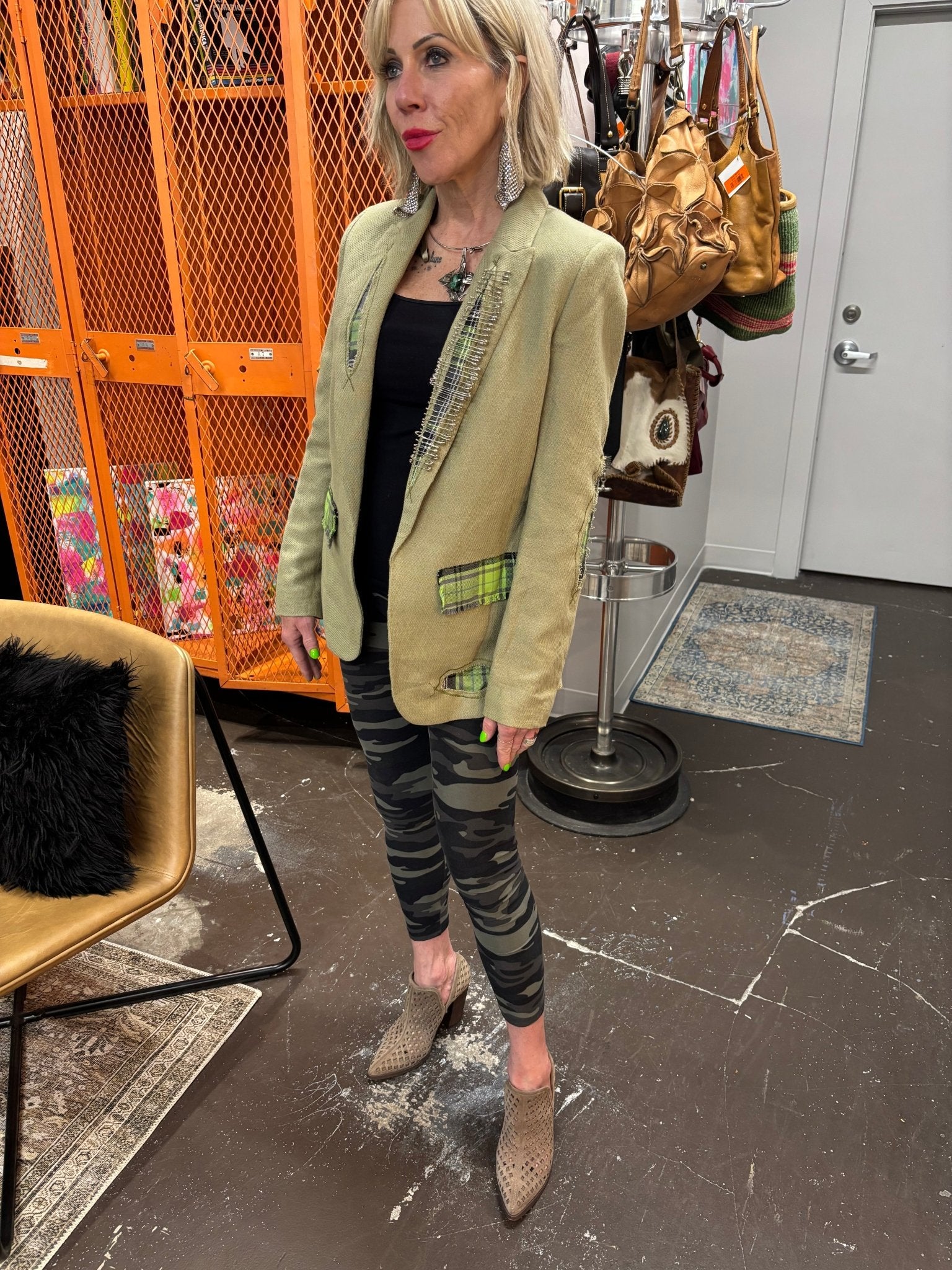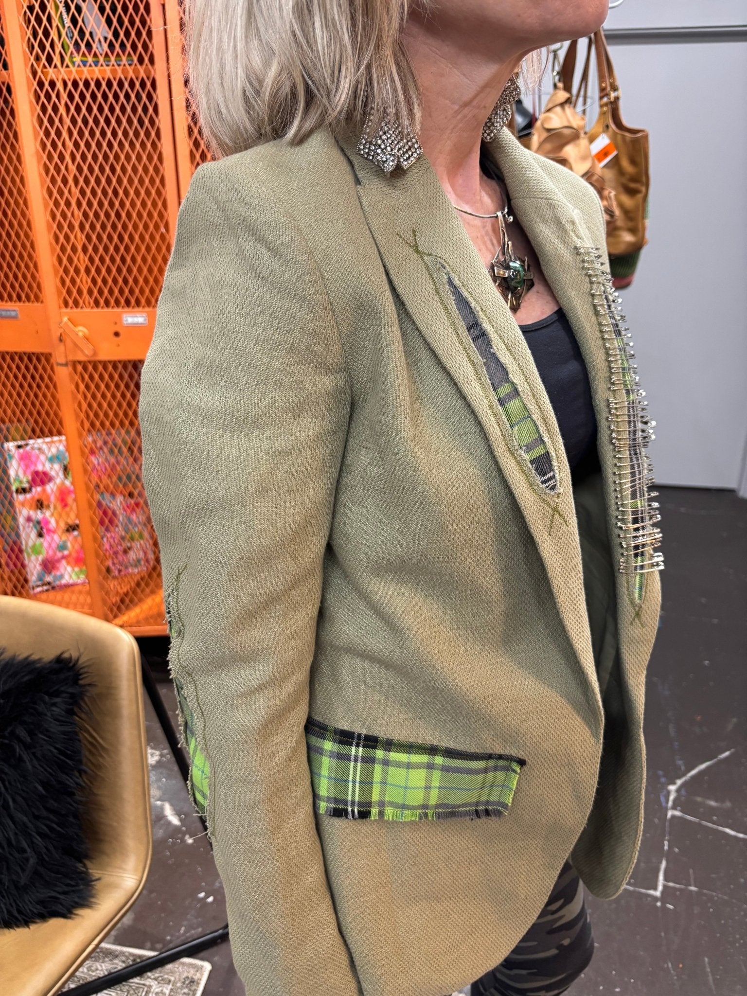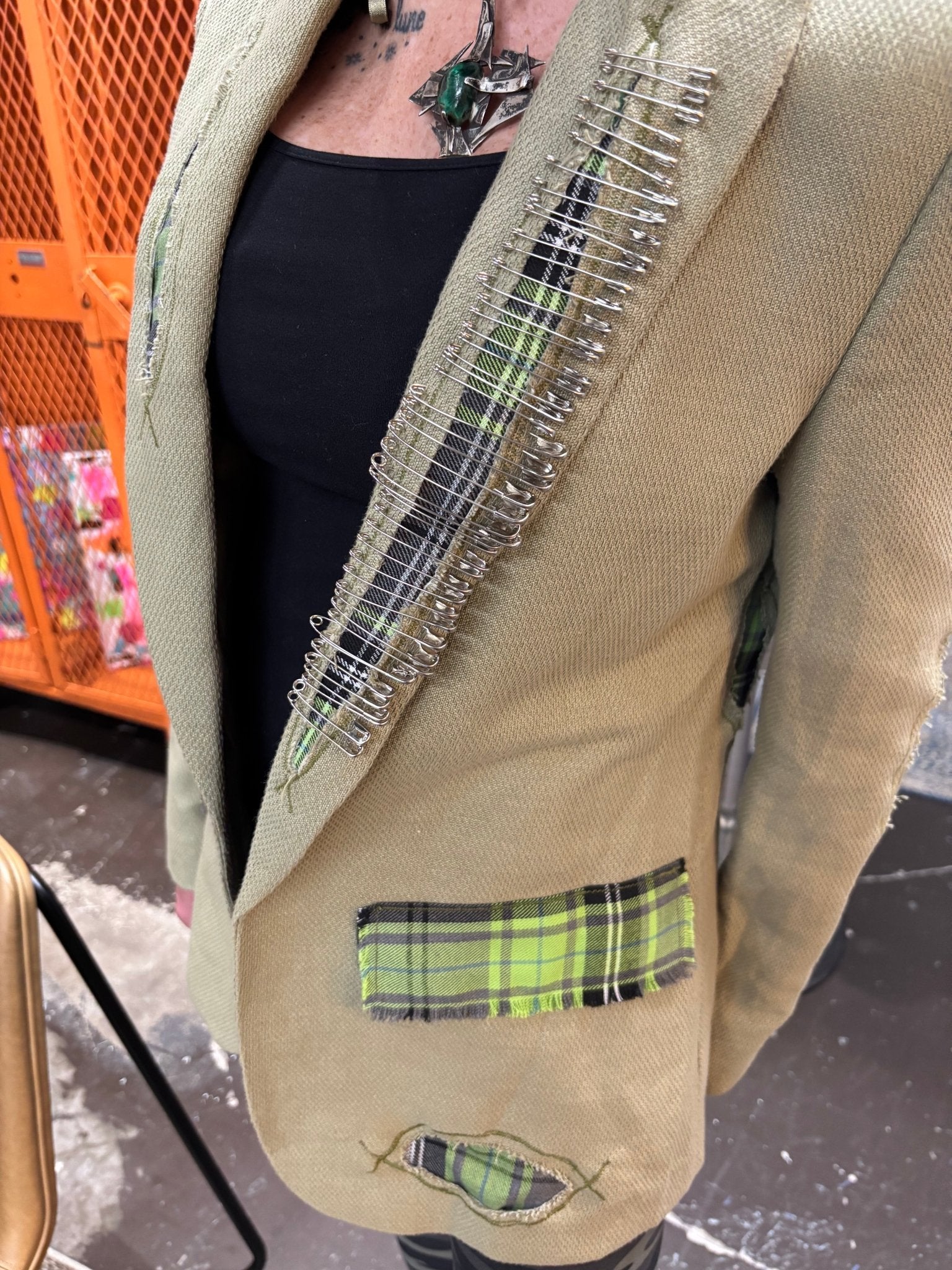 Customized Punk Safety Pin Plaid Blazer - Upcycled Edgy Fashion Statement